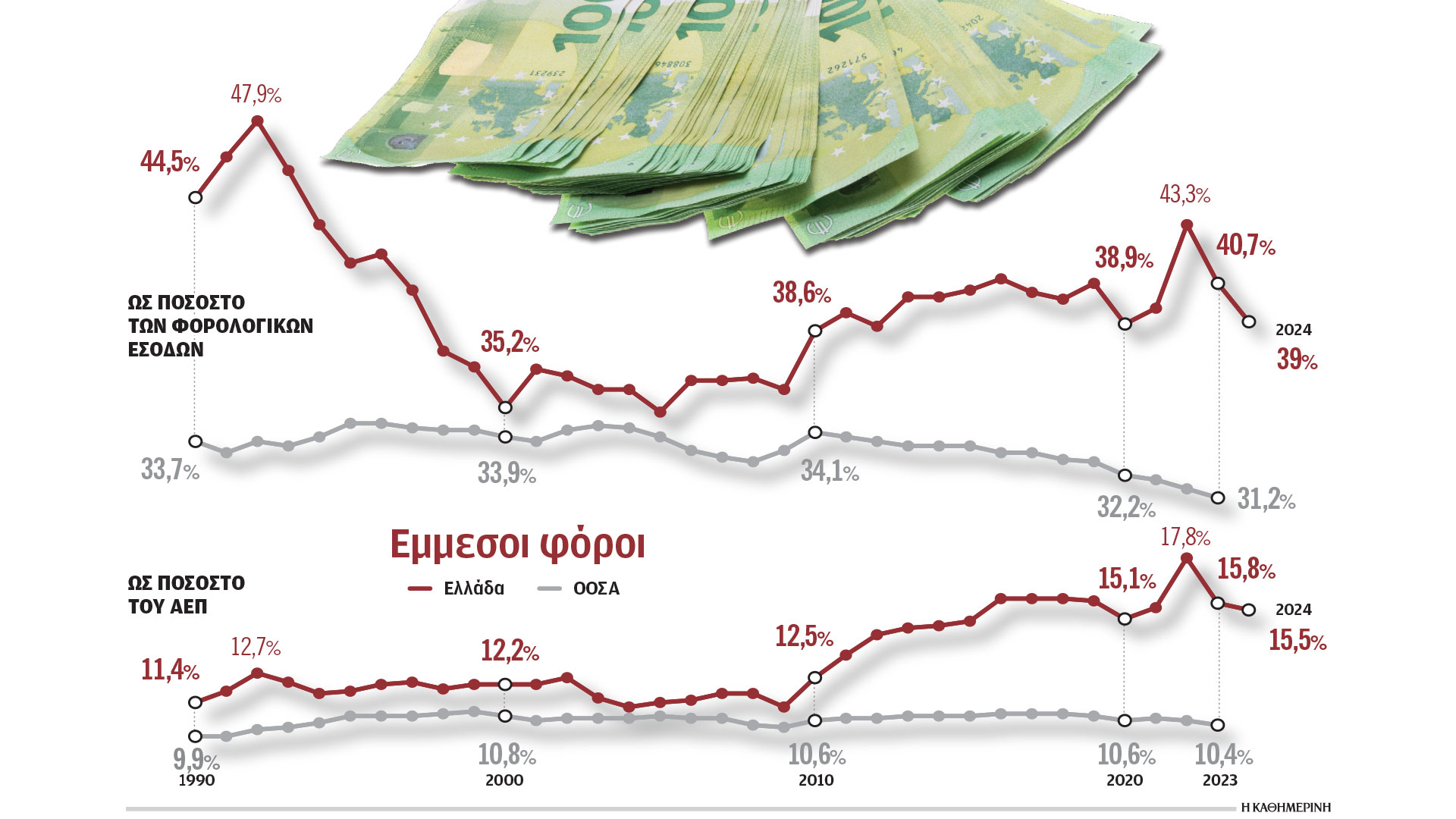 Συνολικά το 2024 τα φορολογικά έσοδα αυξήθηκαν στο 39,8% του ΑΕΠ έναντι 34,1% κατά μέσον όρο στον ΟΟΣΑ.
