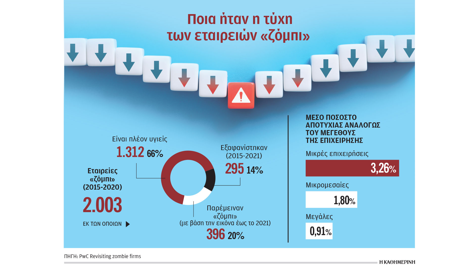 Υγιείς θεωρούνται πλέον δύο στις τρεις επιχειρήσεις που βρέθηκαν σε κατάσταση «ζόμπι» την περίοδο της οικονομικής κρίσης, ενώ σε ποσοστό 14% που ήταν σε αυτή την κατάσταση έκλεισαν οριστικά, βγαίνοντας από τον επιχειρηματικό χάρτη. Αν και αυτή η εξέλιξη είναι ενθαρρυντική, το γεγονός ότι υπάρχει ένα ακόμη 20% από τις παραπάνω επιχειρήσεις που εξακολουθεί να βρίσκεται σε κατάσταση «ζόμπι», με συνεχείς δηλαδή ζημιογόνες χρήσεις και συσσωρευμένα χρέη, μεταφράζεται σε επιβάρυνση για την υγιή επιχειρηματικότητα, καθώς τα «ζόμπι» απομυζούν πόρους.