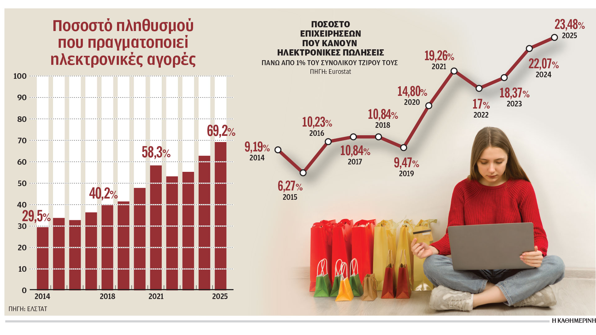 «Η μεγάλη ώθηση και μια από τις αιτίες για να δημιουργήσουμε το e-shop ήταν ο κορωνοϊός: ή θα έβλεπα την επιχείρηση να διαλύεται ή θα έκανα κάτι για αυτό», επισημαίνει η κ. Κωνσταντίνου. Η πραγματικότητα, όντως, είναι αυτή. Εάν την προηγούμενη δεκαετία ήταν τα capital controls που έδωσαν την πρώτη ώθηση στο ηλεκτρονικό εμπόριο, ο κορωνοϊός το απογείωσε. Σύμφωνα με τα στοιχεία της Ελληνικής Στατιστικής Αρχής (ΕΛΣΤΑΤ), το ποσοστό του πληθυσμού ηλικίας άνω των 16 ετών που έχει κάνει φέτος τουλάχιστον μία αγορά από ηλεκτρονικό κατάστημα έχει φτάσει το 69,2% από 62,8% πέρυσι και 29,5% το 2014. Το ποσοστό των επιχειρήσεων που πραγματοποιεί ηλεκτρονικές πωλήσεις οι οποίες αντιστοιχούν σε πάνω από 1% του τζίρου τους είναι, σύμφωνα με τη Eurostat, το 23,48% του συνόλου, από 6,27% δέκα χρόνια πριν. Ο κύκλος εργασιών των επιχειρήσεων με προσωπικό από δέκα άτομα και άνω από ηλεκτρονικές παραγγελίες ανήλθε, σύμφωνα με την ΕΛΣΤΑΤ, το 2024 σε 31,4 δισ. ευρώ, ενώ σήμερα αναμένονται τα αποτελέσματα για το 2025. Το να δημιουργήσεις μια ιστοσελίδα, μια εφαρμογή ή ακόμη και να βάλεις τα προϊόντα σου σε μια πλατφόρμα –χωρίς να διαθέτεις δικό σου e-shop– δεν σημαίνει ότι αρκεί για να γίνουν οι ηλεκτρονικές πωλήσεις. Χρειάζεται αξιοπιστία στις αποστολές, στις πληρωμές, στα αποθέματα, στη συσκευασία.