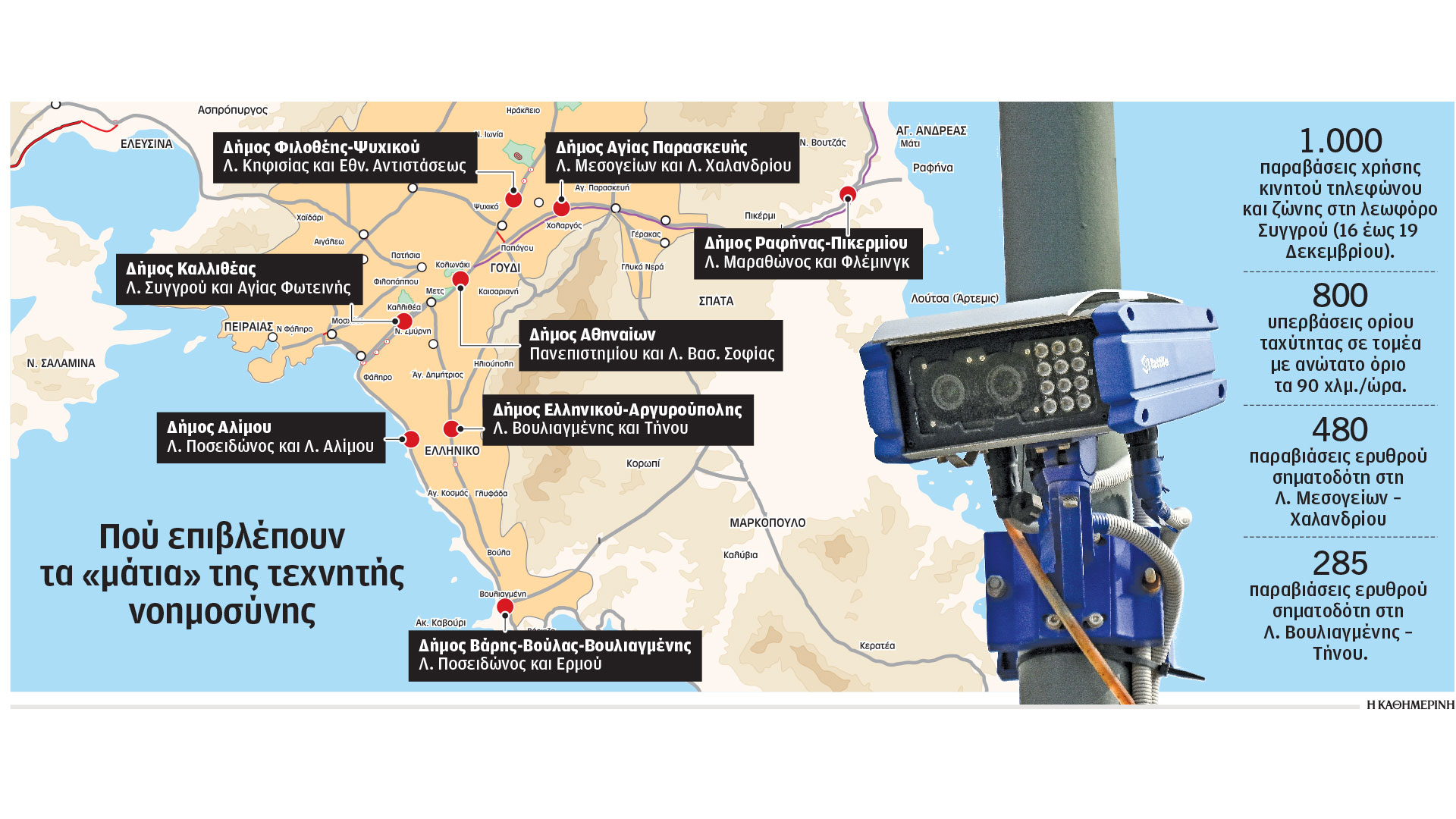 Ειδικότερα, η κάμερα που έχει τοποθετηθεί στη λεωφόρο Συγγρού έχει καταγράψει περισσότερες από 1.000 παραβιάσεις χρήσης κινητού τηλεφώνου και ζώνης. Στο εν λόγω σημείο, έχουν σημειωθεί περίπου 800 υπερβάσεις ορίου ταχύτητας σε τομέα με ανώτατο όριο τα 90 χλμ./ώρα. Αλλες σοβαρές παραβάσεις περιλαμβάνουν 480 παραβιάσεις ερυθρού σηματοδότη στη Λ. Μεσογείων – Χαλανδρίου και 285 παραβιάσεις στη Λ. Βουλιαγμένης – Τήνου.