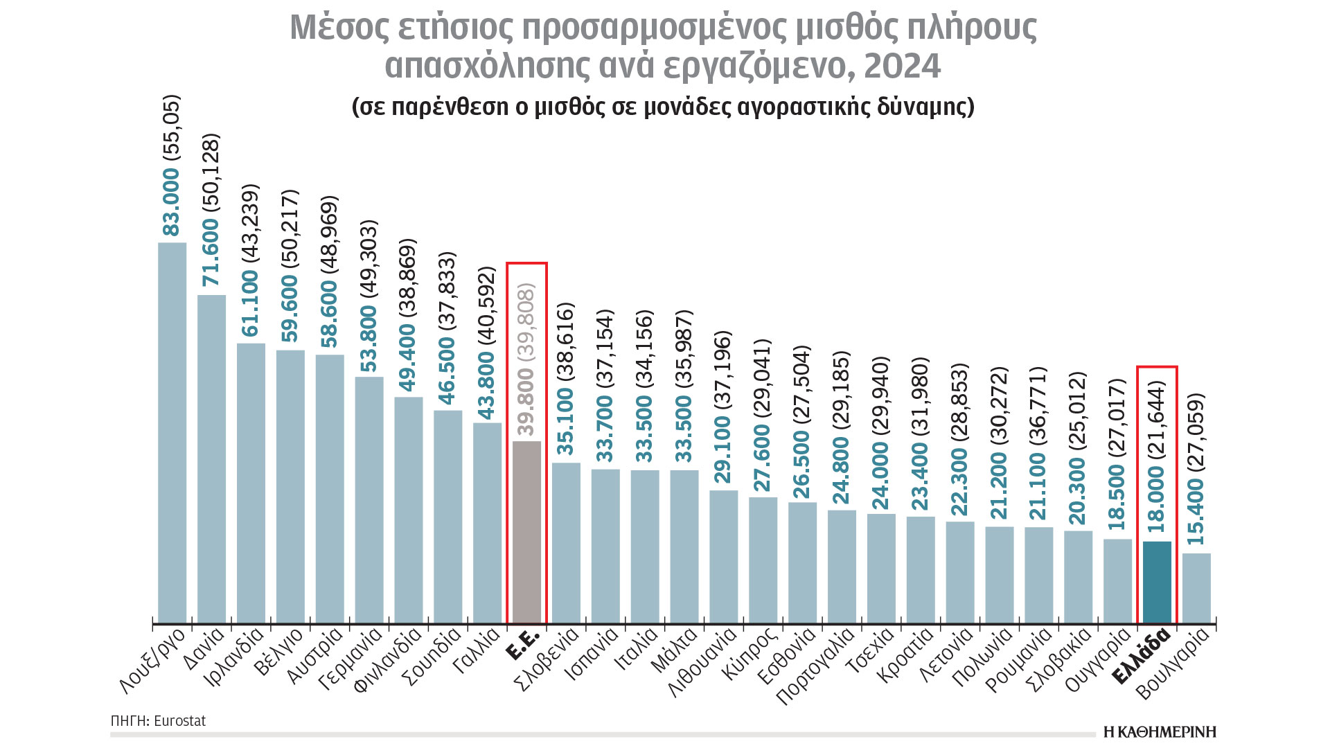 Βάσει στοιχείων της Eurostat, το 2024 η Ελλάδα, ως προς τον μέσο ετήσιο προσαρμοσμένο μισθό πλήρους απασχόλησης (18.000 ευρώ), κατατάσσεται στη δεύτερη χαμηλότερη θέση στην Ε.Ε., με ελάχιστη απόσταση από τη Βουλγαρία (15.400 ευρώ), που βρίσκεται στην τελευταία θέση. Συγκριτικά με τον ευρωπαϊκό μέσο όρο, ο μέσος ετήσιος μισθός στην Ελλάδα είναι 55% χαμηλότερος. Το πιο αποκαλυπτικό, ωστόσο, προκύπτει όταν η σύγκριση γίνεται με βάση την αγοραστική δύναμη (PPS). Και εδώ η Ελλάδα εμφανίζει τη χαμηλότερη τιμή (21.644 PPS), περίπου 46% χαμηλότερα από τον μέσο όρο της Ε.Ε. (39.808 PPS). Oταν μια χώρα είναι ουραγός σε μισθούς και αγοραστική δύναμη, τα νοικοκυριά βρίσκονται σε παρατεταμένη πίεση και οι πολίτες σε σταδιακή φτωχοποίηση…