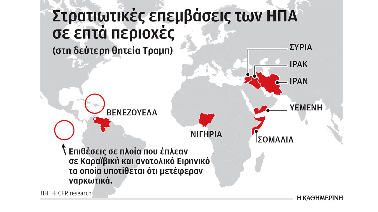 Στη δεύτερη θητεία Τραμπ, οι ΗΠΑ έχουν βομβαρδίσει το Ιράν, το Ιράκ, τη Νιγηρία, τη Σομαλία, τη Συρία και την Υεμένη. Επιπλέον, υπό την επίκληση του πολέμου κατά του εμπορίου ναρκωτικών, έχουν επιτεθεί σε σκάφη στην Καραϊβική και στον Ειρηνικό. Αλλωστε, οι αμερικανικές δυνάμεις διενήργησαν θεαματική στρατιωτική επιχείρηση στη Βενεζουέλα, αιχμαλωτίζοντας το ζεύγος Μαδούρο.