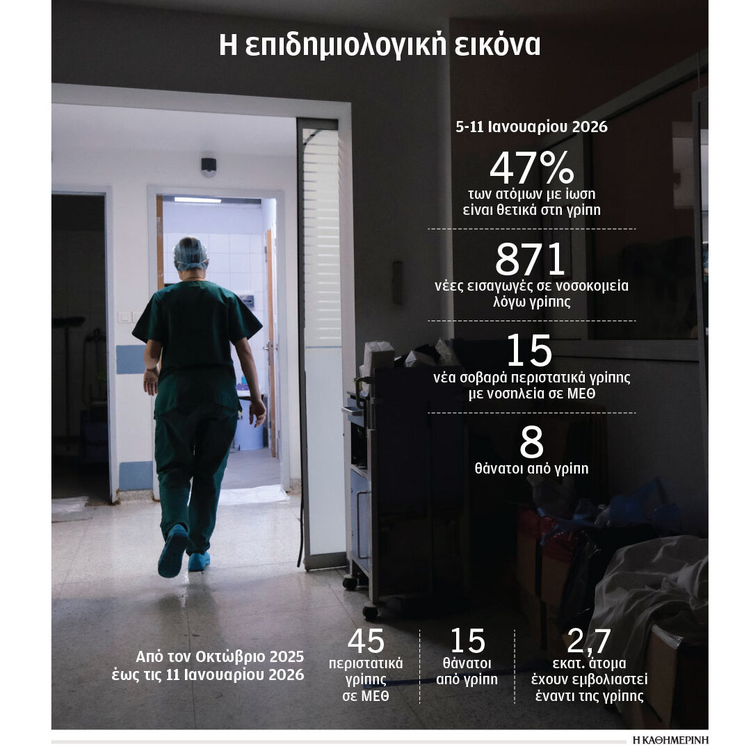 Σύμφωνα με την εβδομαδιαία έκθεση επιδημιολογικής επιτήρησης αναπνευστικών λοιμώξεων, την προηγούμενη εβδομάδα το 16% των επισκέψεων σε γιατρό της πρωτοβάθμιας φροντίδας υγείας ήταν από άτομα με συμπτώματα ίωσης του αναπνευστικού. Το 47% αυτών βγήκε θετικό στη γρίπη. Καταγράφηκαν 871 νέες εισαγωγές σε νοσοκομεία λόγω γρίπης έναντι 722 και 497 τις δύο εβδομάδες που προηγήθηκαν αυτής. Δηλαδή κατεγράφη αύξηση κατά 20,46% στις νέες νοσηλείες. Την εβδομάδα 29/12/2025 – 4/1/2026 είχε καταγραφεί αύξηση κατά 45,27%. Σημειώνεται ότι ο αριθμός των ασθενών που επισκέφθηκαν τα ΤΕΠ είναι πολλαπλάσιος των νοσηλειών. Την προηγούμενη εβδομάδα καταγράφηκαν 15 νέα σοβαρά κρούσματα με νοσηλεία σε ΜΕΘ και οκτώ νέοι θάνατοι. Συνολικά από τις αρχές Οκτωβρίου 2025 έως την Κυριακή είχαν δηλωθεί στον ΕΟΔΥ 45 σοβαρά κρούσματα σε ΜΕΘ και 15 θάνατοι.