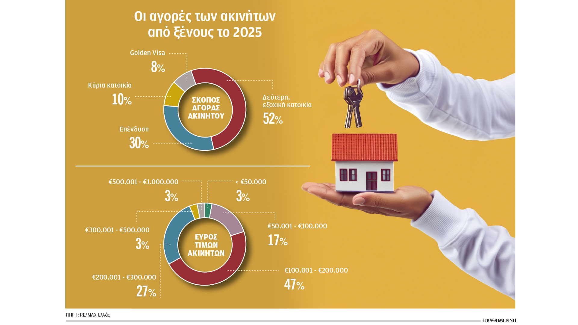 Εξοχικές κατοικίες αξίας 100.000 έως 200.000 ευρώ επέλεξε σχεδόν το 50% των ξένων αγοραστών ακινήτων στην ελληνική αγορά το 2025, σύμφωνα με τα στοιχεία έρευνας του δικτύου μεσιτικών γραφείων RE/MAX Ελλάς, που βασίστηκε στις αγοραπωλησίες που πραγματοποιήθηκαν τον περασμένο χρόνο. Συγκεκριμένα, το 52% αγόρασε ακίνητο ως δεύτερη ή εξοχική κατοικία, ενώ το 47% των αγορών αφορούσε κατοικίες αξίας από 100.000 έως 200.000 ευρώ.