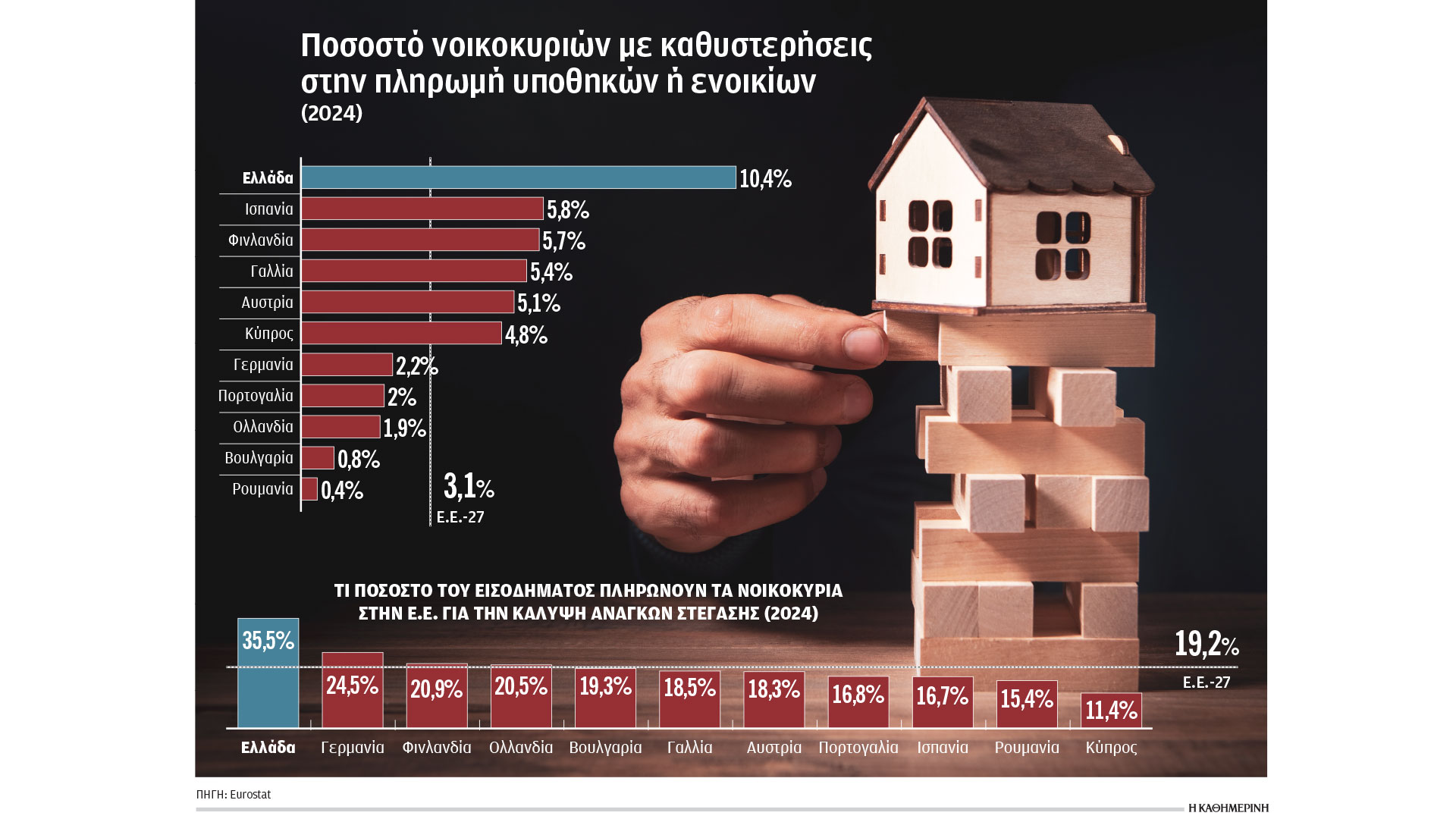 Κάπως έτσι, το 10,4% των νοικοκυριών στην Ελλάδα αντιμετωπίζει σήμερα (στοιχεία 2024) πρόβλημα στην εξυπηρέτηση των υποχρεώσεών του, καθώς καθυστερεί να αποπληρώσει το ενοίκιο ή τις δόσεις του στεγαστικού δανείου του. Ασφαλώς και πρόκειται για το υψηλότερο ποσοστό στην Ε.Ε. Σύμφωνα με την ανάλυση, «η μη έγκαιρη κάλυψη στεγαστικών υποχρεώσεων είναι ένα ευρέως διαδεδομένο πρόβλημα, το οποίο αποτελεί σημαντικό παράγοντα απόκλισης από τις υπόλοιπες χώρες της Ευρωπαϊκής Ενωσης. Είναι χαρακτηριστικό ότι ο μέσος όρος στην Ε.Ε. είναι μόλις 3,1%, ενώ η δεύτερη χώρα μετά την Ελλάδα είναι η Ισπανία, με 5,8% των νοικοκυριών με οφειλές σε καθυστέρηση. Ακολουθούν η Φινλανδία (5,7%), η Ιρλανδία (5,6%) και η Γαλλία (5,4%), ενώ η χώρα με την καλύτερη εικόνα είναι η Ρουμανία, με μόλις 0,4% των νοικοκυριών να καθυστερεί τις πληρωμές του.