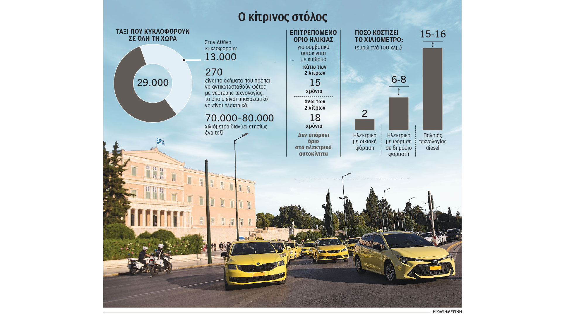 Πολλοί ίσως αναρωτηθούν πού θα φορτίζει ο στόλος των περίπου 13.000 ταξί, τα οποία κυκλοφορούν στην Αθήνα, όταν αυτά θα γίνουν ηλεκτρικά. Ο αναπληρωτής υπουργός Μεταφορών Κωνσταντίνος Κυρανάκης σε συνέντευξή του στη δημόσια τηλεόραση, εν μέσω της πρώτης 48ωρης απεργίας, υποστήριξε ότι το μέτρο αφορά στην πράξη ένα εξαιρετικά μικρό τμήμα του κλάδου, κάνοντας λόγο για εσφαλμένη εικόνα που καλλιεργείται από τη συνδικαλιστική ηγεσία. Οπως τόνισε, η σχετική νομοθεσία δεν αποτελεί αιφνιδιασμό, καθώς έχει θεσπιστεί ήδη από το 2021 και προβλέπει ότι από το 2026 και μετά, κάθε νέο ταξί που ταξινομείται θα πρέπει να είναι μηδενικών εκπομπών. Σύμφωνα με τα στοιχεία που παρουσίασε, οι οδηγοί που επηρεάζονται άμεσα σήμερα δεν ξεπερνούν τους 270, σε σύνολο περίπου 29.000 ταξί σε όλη τη χώρα. Η πλειονότητα των επαγγελματιών, όπως ανέφερε, είχαν τη δυνατότητα τα προηγούμενα χρόνια να ανανεώσουν τον στόλο των αυτοκινήτων τους, εξασφαλίζοντας έτσι μακροχρόνια ισχύ της άδειας κυκλοφορίας και μεταθέτοντας χρονικά την υποχρέωση.