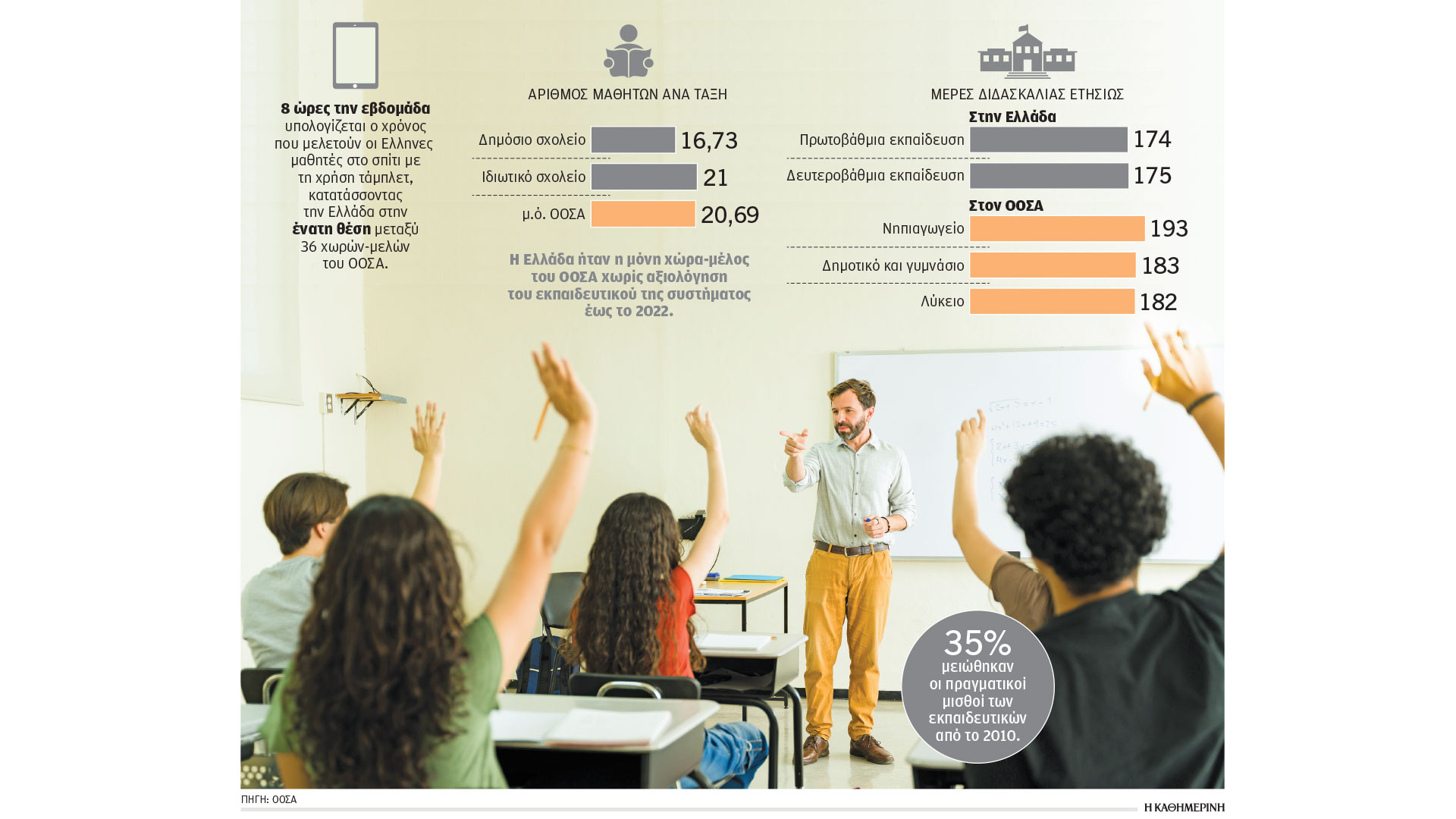 Από την άλλη όμως, σύμφωνα με τα στοιχεία του ΟΟΣΑ, οι πραγματικοί μισθοί των εκπαιδευτικών μειώθηκαν κατά 35% από το 2010, ενώ οι εκπαιδευτικοί έχουν αμοιβές οι οποίες εξαρτώνται αποκλειστικά από τα έτη υπηρεσίας και τα τυπικά προσόντα.