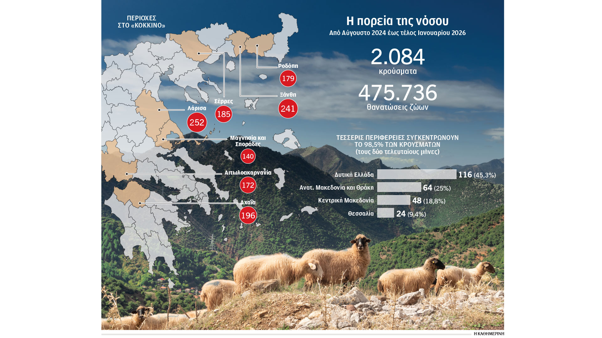 Οι περιφέρειες όπου έχουν εντοπιστεί τα περισσότερα κρούσματα τους δύο τελευταίους μήνες είναι η Δυτική Ελλάδα με 116 (45,3%), η Ανατολική Μακεδονία και Θράκη με 64 (25%), η Κεντρική Μακεδονία με 48 (18,8%) και η Θεσσαλία με 24 (9,4%). Από τον Αύγουστο του 2024 έως και το τέλος Ιανουαρίου 2026 έχουν εντοπιστεί 2.084 κρούσματα και έχουν θανατωθεί 475.736 ζώα.