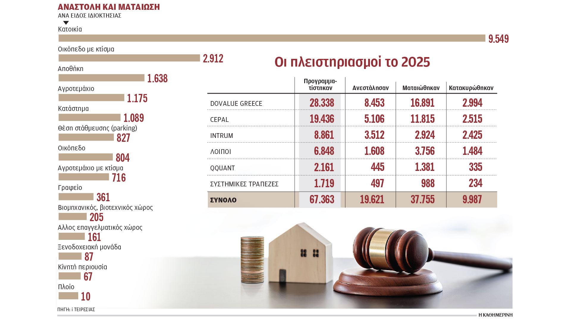 Το πρόβλημα δεν εντοπίζεται μόνο στις κατοικίες. Αφορά το σύνολο των ακινήτων που άλλαξαν χέρια μέσω πλειστηριασμών τον προηγούμενο χρόνο, που περιλαμβάνουν από θέσεις στάθμευσης έως βιομηχανικά κτίρια, εμπορικά καταστήματα, οικόπεδα, αγροτεμάχια κ.ά. Συνολικά το 2025 προγραμματίστηκε να διεξαχθούν 67.363 πλειστηριασμοί ακινήτων έναντι 69.026 το 2024. Από αυτούς, αγοραστή βρήκαν οι 9.987 έναντι 12.476 το 2024, περιορίζοντας το ποσοστό των γόνιμων πλειστηριασμών μόλις στο 14,8%, δηλαδή περίπου ένας στους επτά. Οι υπόλοιποι ματαιώθηκαν είτε ανεστάλησαν είτε, ενώ πραγματοποιήθηκαν, δεν κατέληξαν με υπερθεματιστή, δηλαδή με αγοραστή.