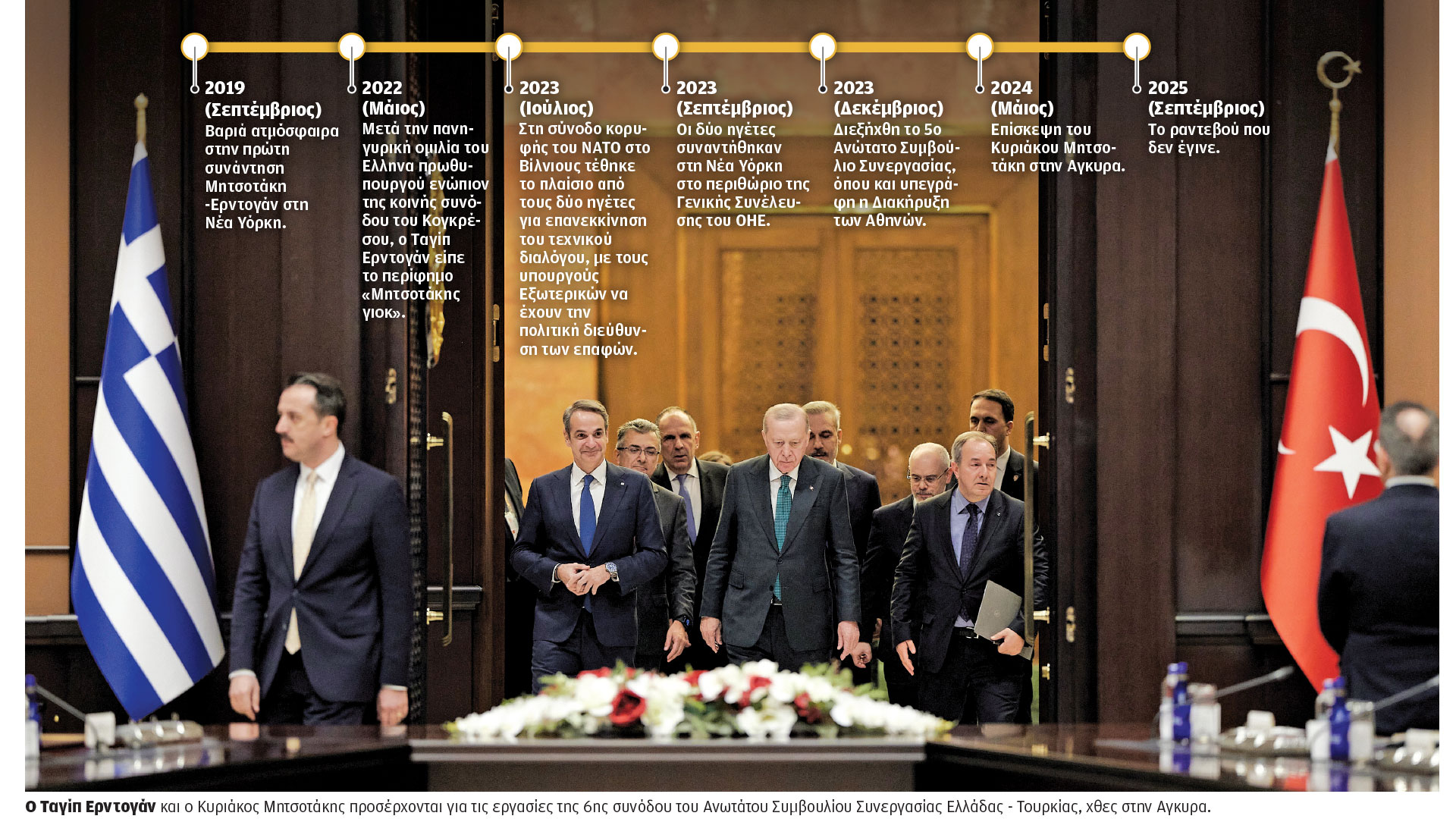 Οι δύο ηγέτες συναντήθηκαν ξανά τον Σεπτέμβριο του 2023 στη Νέα Υόρκη (περιθώριο Γενικής Συνέλευσης του ΟΗΕ), ενώ στις 7 Δεκεμβρίου του ίδιου έτους διεξήχθη το 5ο Ανώτατο Συμβούλιο Συνεργασίας, όπου και υπεγράφη η Διακήρυξη των Αθηνών. Ο κ. Μητσοτάκης ανταπέδωσε την επίσκεψη στην Αγκυρα στις 14 Μαΐου 2024, ενώ οι δύο ηγέτες συναντήθηκαν ξανά τον Σεπτέμβριο του 2024.