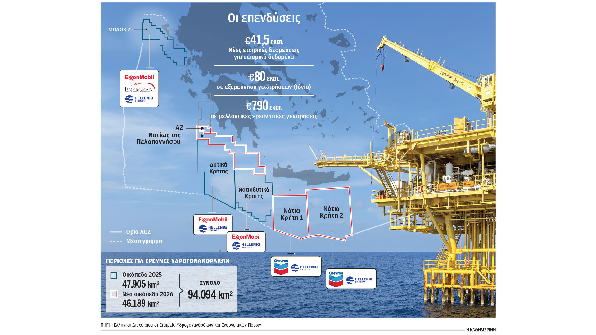 Δεσμεύσεις για επενδύσεις ύψους 1 δισ. ευρώ, ύψιστης γεωπολιτικής σημασίας πέραν της οικονομικής, ανέλαβαν οι αμερικανικοί κολοσσοί ΕxxonMobil και Chevron για να διερευνήσουν την ύπαρξη πιθανών κοιτασμάτων υδρογονανθράκων. Το συνολικό πρόγραμμα ενεργών περιοχών για έρευνες, μετά και την επίσημη είσοδο της Chevron στην Ελλάδα, εκτείνεται σε μια περιοχή 94.000 τετραγωνικών χιλιομέτρων, από 47.905 τετραγωνικά χιλιόμετρα πριν, αυξάνοντας τις πιθανότητες για τον εντοπισμό εκμεταλλεύσιμων κοιτασμάτων.