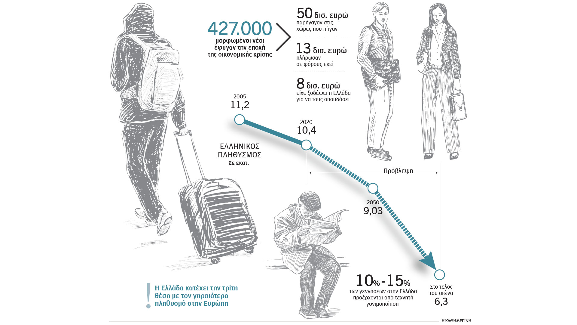 Το δημογραφικό πρόβλημα της Ελλάδας, η οποία βρίσκεται στην τρίτη θέση στην Ε.Ε. όσον αφορά τη γήρανση του πληθυσμού, επιδεινώθηκε όταν, την εποχή της οικονομικής κρίσης, 427.000 νέοι και νέες που βρίσκονταν σε ηλικία δημιουργίας οικογένειας έφυγαν από τη χώρα. Ο οικονομικός αντίκτυπος της μετανάστευσης αυτού του πληθυσμού για τη χώρα ήταν μεγάλο, όπως έχει εκτιμηθεί. Υπολογίζεται ότι οι άνθρωποι αυτοί στις χώρες που εργάστηκαν παρήγαγαν 50 δισ. ευρώ και κατέβαλαν φόρους ύψους 13 δισ. ευρώ. Παράλληλα η Ελλάδα έχασε τη δυνατότητα να απολαύσει τους καρπούς της επένδυσης ύψους 8 δισ. ευρώ που είχε ξοδέψει για την εκπαίδευση όλου αυτού του πληθυσμού.