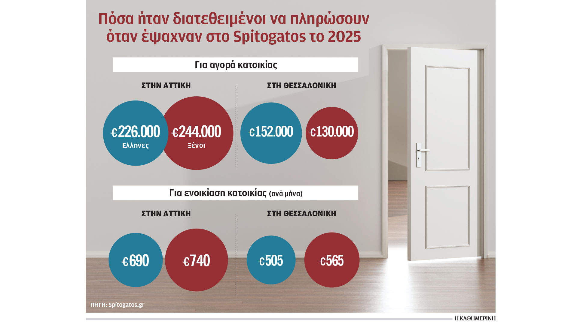 Οπως δείχνουν τα στοιχεία από τις αναζητήσεις κατοικιών για αγορά και ενοικίαση που πραγματοποιήθηκαν το 2025 μέσω της πλατφόρμας ηλεκτρονικών αγγελιών Spitogatos.gr, φαίνεται πως πέρυσι οι ξένοι δεν ήταν το ίδιο διατεθειμένοι να καταβάλουν μεγάλες υπεραξίες έναντι των Ελλήνων, ενώ συνολικά οι αναζητήσεις τους αφορούσαν ακίνητα όχι πολύ μεγαλύτερης αξίας, ειδικά σε σχέση με το 2024. Αυτό είναι ένα από τα βασικότερα συμπεράσματα που προκύπτουν από τη σχετική ανάλυση η οποία παρουσιάστηκε πρόσφατα, στην ειδική εκδήλωση «Ελλάδα 2026. Επιχειρείν, Ακίνητα, Επενδύσεις», του επενδυτή και αναλυτή Ηλία Παπαγεωργιάδη.
