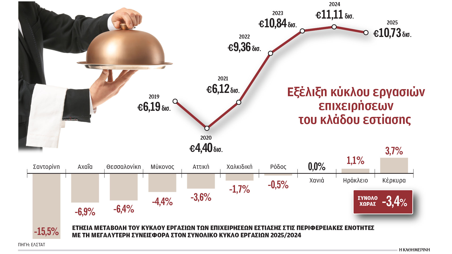 Μείωση για πρώτη φορά από το 2020, όταν ξέσπασε η πανδημία και επιβλήθηκε lockdown, σημείωσε το 2025 ο κύκλος εργασιών στις επιχειρήσεις εστίασης, με τα στοιχεία της Ελληνικής Στατιστικής Αρχής (ΕΛΣΤΑΤ) να επιβεβαιώνουν τις εκτιμήσεις του κλάδου, αλλά και των επιχειρήσεων που σχετίζονται άμεσα με αυτόν, όπως οι ζυθοποιίες και οι εταιρείες αναψυκτικών. Μάλιστα, ο κύκλος εργασιών των επιχειρήσεων εστίασης έπεσε κάτω και από τα επίπεδα του 2023, ενώ οι απώλειες σε σύγκριση με το 2024 ανέρχονται σε περίπου 383 εκατ. ευρώ, ποσό ιδιαιτέρως υψηλό.