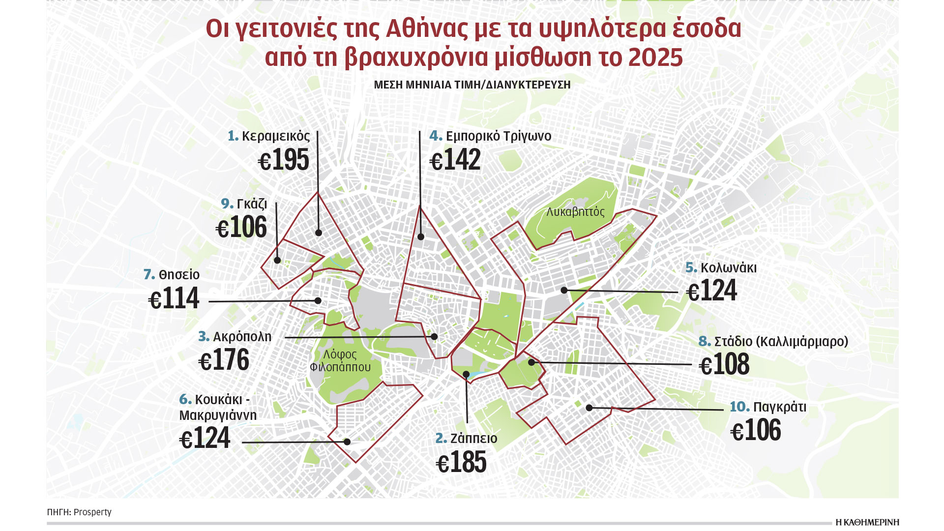 Αντιστοίχως, όπως φαίνεται, τα καταλύματα στην Αθήνα δεν συγκαταλέγονται και μεταξύ των αποδοτικότερων, καθώς τα ετήσια έσοδα δεν ξεπερνούν τις 8.800 ευρώ κατά μέσον όρο. Αυτό οφείλεται κυρίως στις χαμηλές τιμές και πληρότητες περιοχών εκτός του κέντρου της πόλης, δηλαδή σε σημεία που δεν έχουν υψηλή τουριστική ζήτηση. Αντιθέτως, σε περιοχές όπως ο Κεραμεικός ή το Ζάππειο τα ετήσια έσοδα ανέρχονται σε 33.800 ευρώ, καθώς η μέση τιμή/διανυκτέρευση αγγίζει τα 195 και 185 ευρώ αντιστοίχως, ενώ ακολουθεί η Ακρόπολη με 176 ευρώ/διανυκτέρευση.