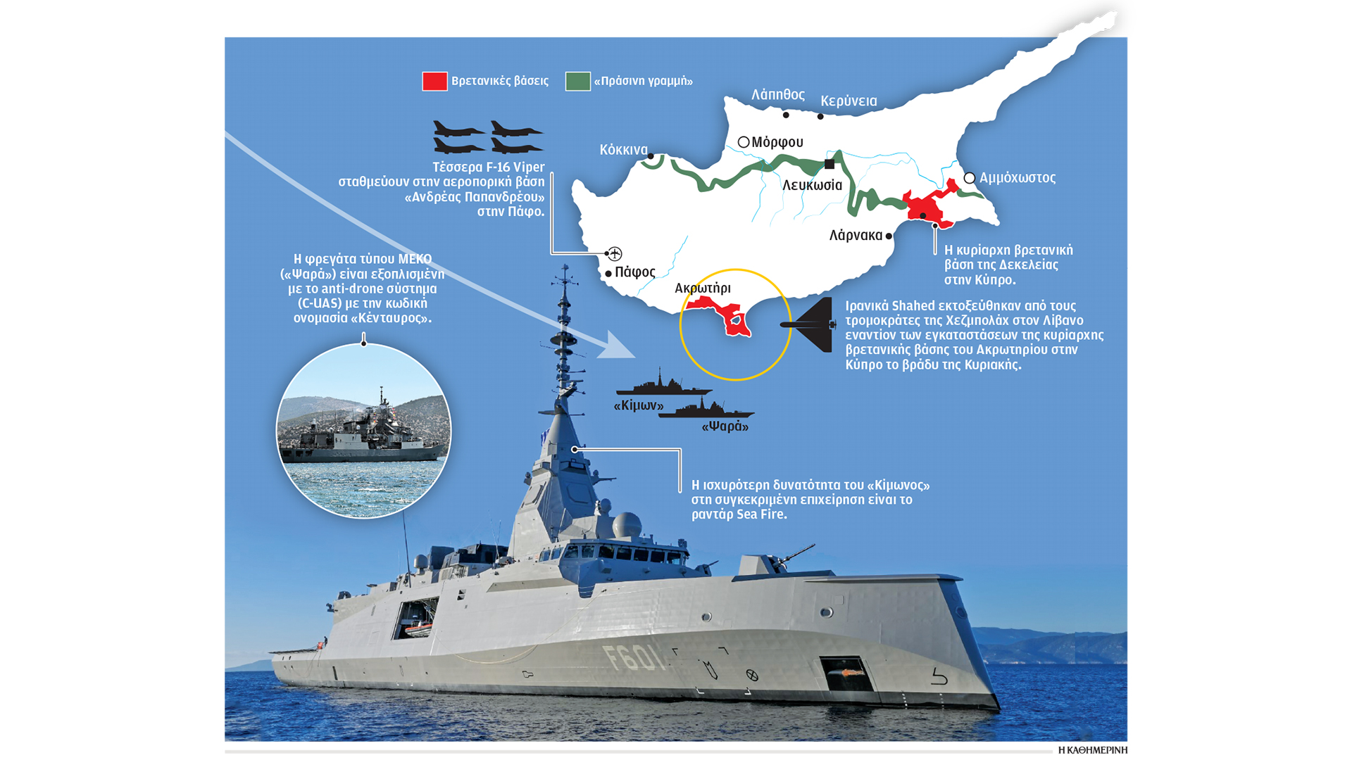 Eμπρακτο μήνυμα αλληλεγγύης της Ελλάδας προς την Κυπριακή Δημοκρατία προκειμένου να αντιμετωπίσει πιθανές απειλές από το Ιράν ή τη Χεζμπολάχ αποτελεί η απόφαση του Κυβερνητικού Συμβουλίου Εθνικής Ασφαλείας (ΚΥΣΕΑ) υπό τον πρωθυπουργό Κυριάκο Μητσοτάκη για την ανάπτυξη δύο φρεγατών και τεσσάρων μαχητικών F-16 Viper στην Κύπρο. Η απόφαση της κυβέρνησης, κατόπιν αιτήματος της Λευκωσίας, στοχεύει στην προστασία της Κυπριακής Δημοκρατίας από την πιθανότητα κάποιες από τις επιθέσεις με πυραύλους ή drones (είτε από το Ιράν είτε από τη Χεζμπολάχ, όπως ήδη έγινε) προς το νησί να ξεφύγουν από το έδαφος των κυρίαρχων βρετανικών βάσεων στο Ακρωτήρι και στη Δεκέλεια, και να πλήξουν άλλες υποδομές στην Κύπρο. Το μήνυμα ετοιμότητας της Ελλάδας να είναι παρούσα στην Κύπρο δεν συνδέεται σε καμία περίπτωση με ενεργοποίηση του Ενιαίου Αμυντικού Δόγματος, αλλά αποτελεί μια συμφωνία ανάμεσα στον κ. Μητσοτάκη και τον πρόεδρο της Κυπριακής Δημοκρατίας Νίκο Χριστοδουλίδη για ένα πολύ συγκεκριμένο θέμα. Και εδράζεται, βεβαίως, στην παραδοχή ότι η κυπριακή αεράμυνα χρειάζεται οπωσδήποτε βοήθεια, προκειμένου να αντέξει σε πιθανές επιθέσεις κορεσμού. Αποτελεί ερώτημα πώς μπορεί να συνεργαστούν οι ελληνικές δυνάμεις στο νησί, δηλαδή τα τέσσερα F-16 που πέταξαν ήδη χθες το βράδυ από την 115 Πτέρυγα Μάχης στη Σούδα, στην αεροπορική βάση «Ανδρέας Παπανδρέου» στην Πάφο, και οι φρεγάτες «Κίμων» και «Ψαρά» που σύντομα θα πλέουν στα ανοιχτά του νησιού. Το ευρύτερο μήνυμα που, βεβαίως, στέλνει η Αθήνα και προς τη Δύση είναι ότι η Ελλάδα αποτελεί σοβαρό δρώντα στην Ανατολική Μεσόγειο, ο οποίος κινείται με στόχο την προάσπιση των συμφερόντων του Ελληνισμού, αλλά και εταίρο στην Ε.Ε.