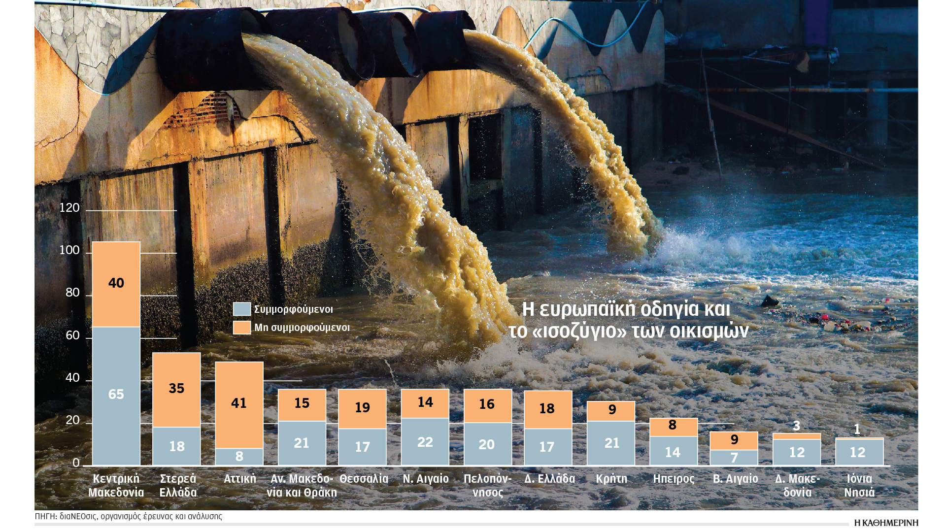 Τα στοιχεία προέρχονται από έρευνα της διαΝΕΟσις για τη διαχείριση υγρών αποβλήτων, η οποία υπογράφεται από οκταμελή ομάδα επιστημόνων, με συντονιστή τον καθηγητή και κάτοχο έδρας UNESCO στο Εθνικό Μετσόβιο Πολυτεχνείο, Κωνσταντίνο Αραβώση. Σύμφωνα με την έρευνα: