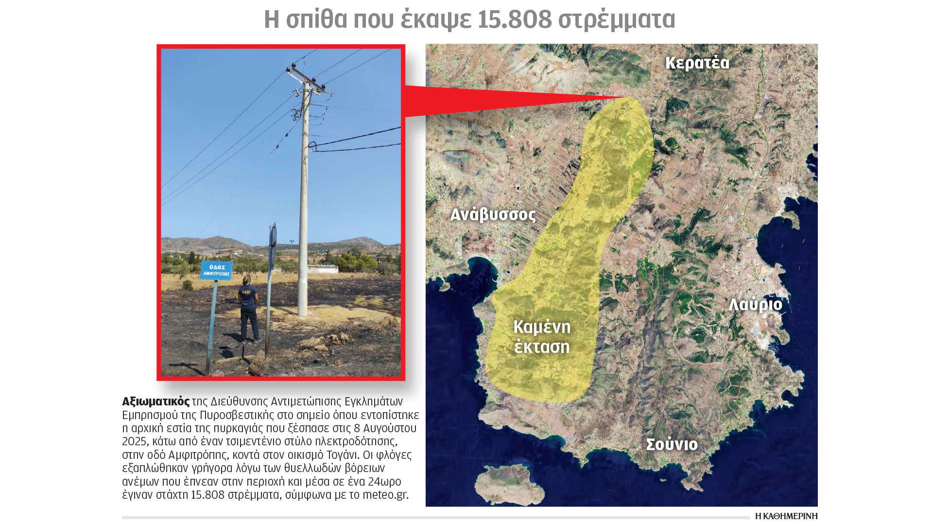 Μετά τον εντοπισμό της αρχικής εστίας στην πυρκαγιά της Κερατέας, οι αξιωματικοί της ΔΑΕΕ έλαβαν την απόφαση για ολονύχτια φύλαξη του στύλου στην οδό Αμφιτρόπης, μέχρι να φτάσει στο σημείο ο πραγματογνώμονας που θα συνέλεγε κρίσιμα στοιχεία. Σε αντίστοιχη φύλαξη χώρου, ώστε να παραμείνει αναλλοίωτος, είχαν προχωρήσει και τον Αύγουστο του 2024, σε μια ξύλινη κολόνα έξω από σπίτι στην οδό Αμαλθείας για την πυρκαγιά του Βαρνάβα.