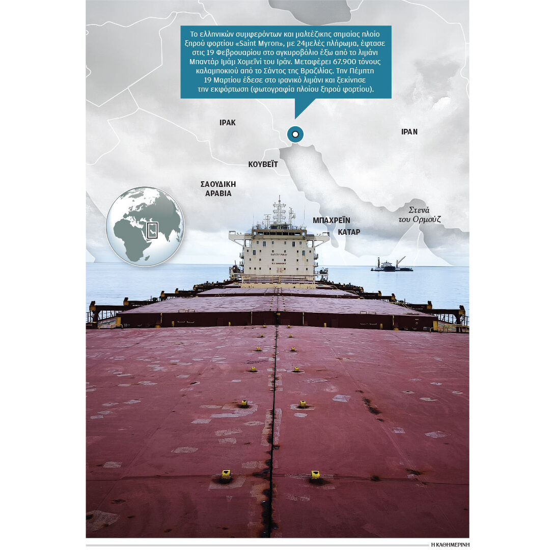 Επειτα από πολυήμερη αναμονή στο αγκυροβόλιο, το ελληνικών συμφερόντων Saint Myron εισήλθε στο ιρανικό λιμάνι στη βόρεια πλευρά του Περσικού Κόλπου την περασμένη Πέμπτη και έχει ξεκινήσει τη διαδικασία της εκφόρτωσης. Εκτιμάται ότι σε περίπου 10 ημέρες θα έχει αδειάσει το φορτίο του και θα χρειαστεί άλλες δύο ημέρες για να φτάσει μέχρι τα Στενά του Ορμούζ. Ο καπετάνιος ελπίζει ότι τότε θα είναι ανοιχτά. Κανείς δεν μπορεί να προβλέψει από τώρα τι συνθήκες θα επικρατούν, εάν θα είναι εφικτή και πώς θα γίνεται η διέλευση για να βγουν από τον Περσικό.