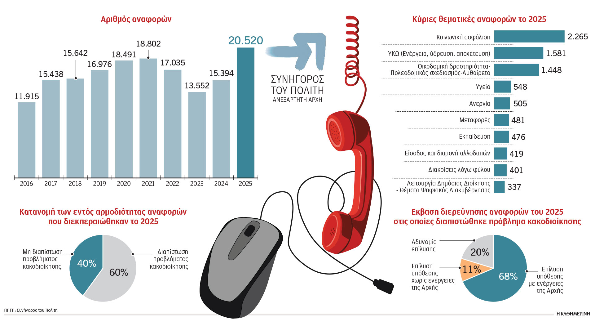 Αποκούμπι για τους πολίτες αποτελεί ο Συνήγορος του Πολίτη σε ένα περιβάλλον διαρκών κρίσεων και αβεβαιότητας. Το 2025, για πρώτη φορά όπως δείχνει έκθεση που δημοσιοποιήθηκε χθες, οι αναφορές των πολιτών έφτασαν στις 20.520 (15.394 το 2024), στοιχείο που δείχνει ότι προσφεύγουν στην Αρχή για να αντιμετωπίσουν τις δυσκολίες της καθημερινότητας σε ένα ευρύ φάσμα κοινωνικών, επαγγελματικών και επιχειρηματικών δραστηριοτήτων, αλλά και για να πιέσουν το κράτος να ανταποκριθεί στις εκ του νόμου υποχρεώσεις του.