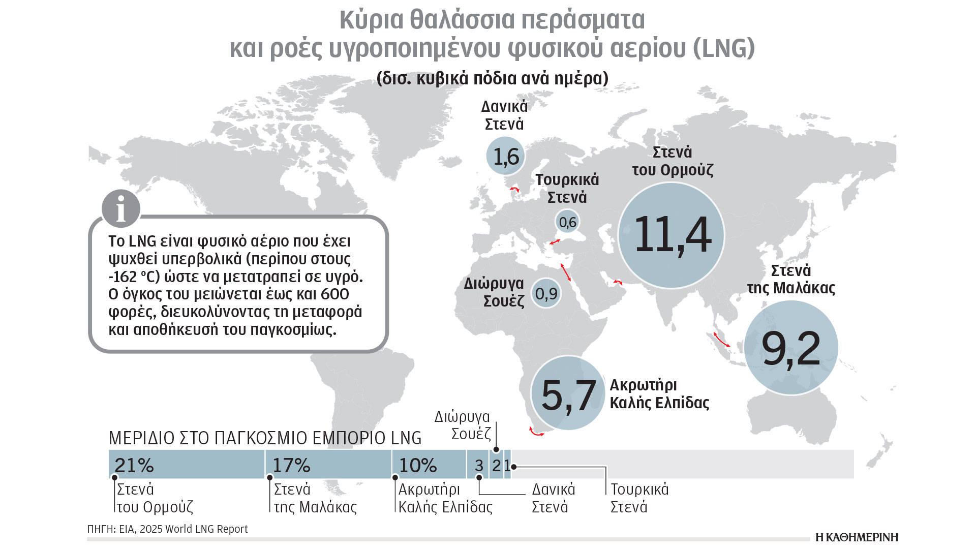 Το 54% του παγκόσμιου εμπορίου LNG διέρχεται από στρατηγικά θαλάσσια στενά. Τα Στενά του Ορμούζ συγκεντρώνουν το 21%, ενώ τα Στενά της Μαλάκας το 17%. Από το 2023, οι επιθέσεις των Χούθι στο στενό Μπαμπ ελ-Μαντέμπ ανάγκασαν τα πλοία να παρακάμπτουν μέσω του Ακρωτηρίου Καλής Ελπίδας (10% της ροής) αυξάνοντας κόστος και χρόνο μεταφοράς. Παράλληλα, ο πόλεμος στο Ιράν ενδέχεται να προκαλέσει απώλειες 11 εκατ. βαρελιών πετρελαίου ημερησίως (υπερδιπλάσια ποσότητα έναντι των κρίσεων του 1973 και του 1979) και έως 140 δισ. κ.μ. φυσικού αερίου ετησίως, εφόσον η σύγκρουση παραταθεί, απειλώντας να εξελιχθεί σε μία από τις μεγαλύτερες ενεργειακές κρίσεις των τελευταίων δεκαετιών.