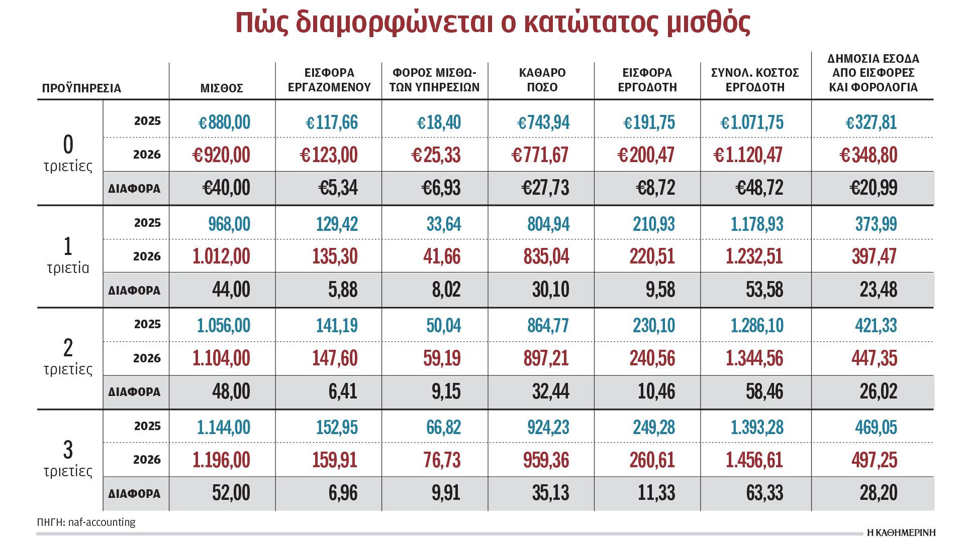 Τον Ιανουάριο του 2026 λάμβανε καθαρά 1.767 ευρώ. Μετά και την αύξηση του κατώτατου θα λαμβάνει 2.702 μεικτά και 1.790 καθαρά. Στα καθαρά, η αύξηση των 40 ευρώ αποφέρει μηνιαία αύξηση περίπου 22 ευρώ.