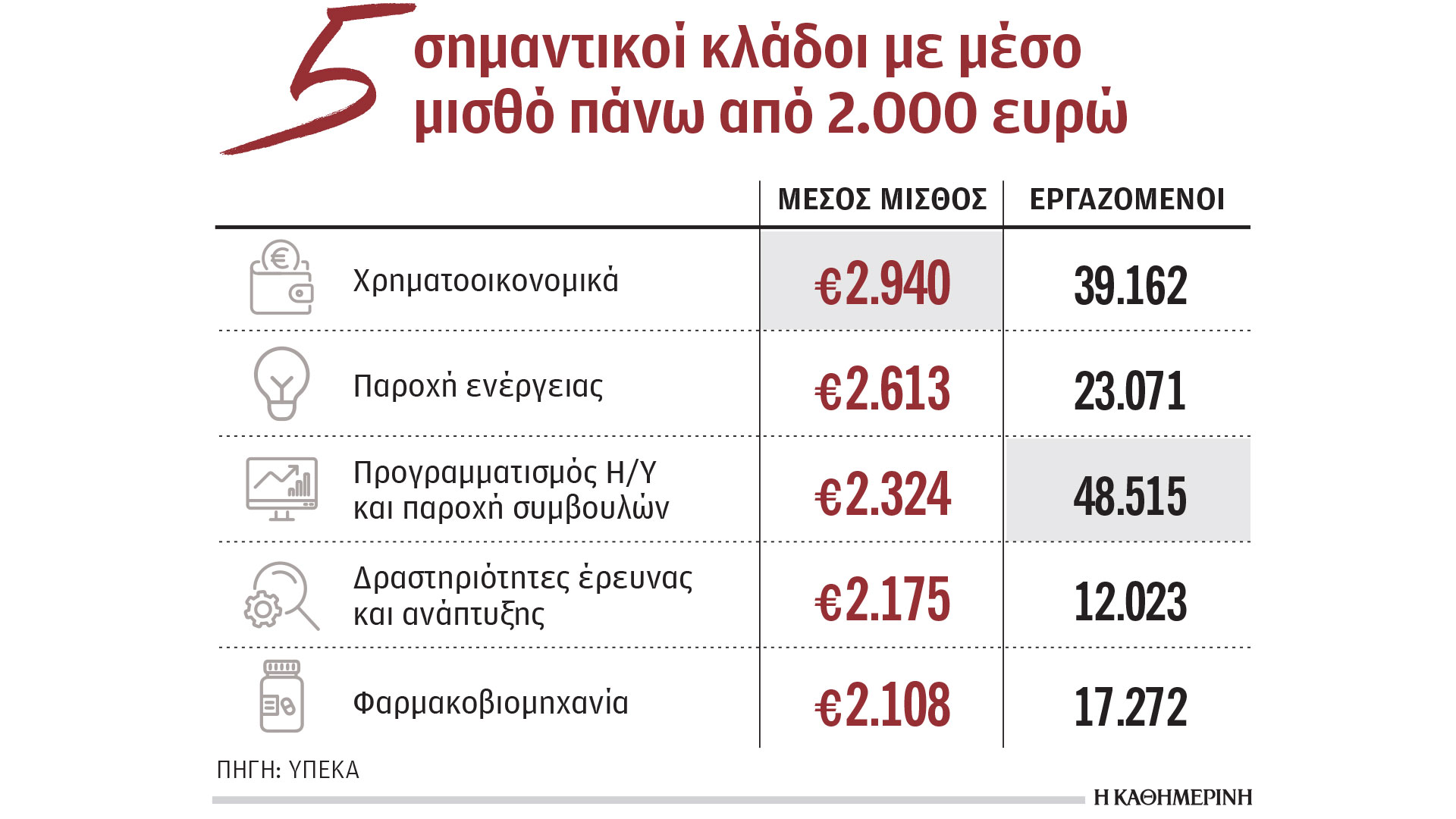 Πέρα από τη δημιουργία θέσεων, οι ίδιοι αυτοί κλάδοι διαμορφώνουν και το νέο μισθολογικό τοπίο. Σύμφωνα με τα στοιχεία του υπουργείου Εργασίας, πέντε βασικοί τομείς καταγράφουν μέσες αποδοχές άνω των 2.000 ευρώ, ξεπερνώντας κατά πολύ τον μέσο μισθό των 1.516 ευρώ. Στην κορυφή βρίσκονται τα χρηματοοικονομικά με μέσο μισθό 2.940 ευρώ, ενώ ακολουθούν η ενέργεια (2.613 ευρώ), ο τομέας πληροφορικής και συμβουλευτικών υπηρεσιών (2.324 ευρώ), η έρευνα και ανάπτυξη (2.175 ευρώ) και η φαρμακοβιομηχανία (2.108 ευρώ).