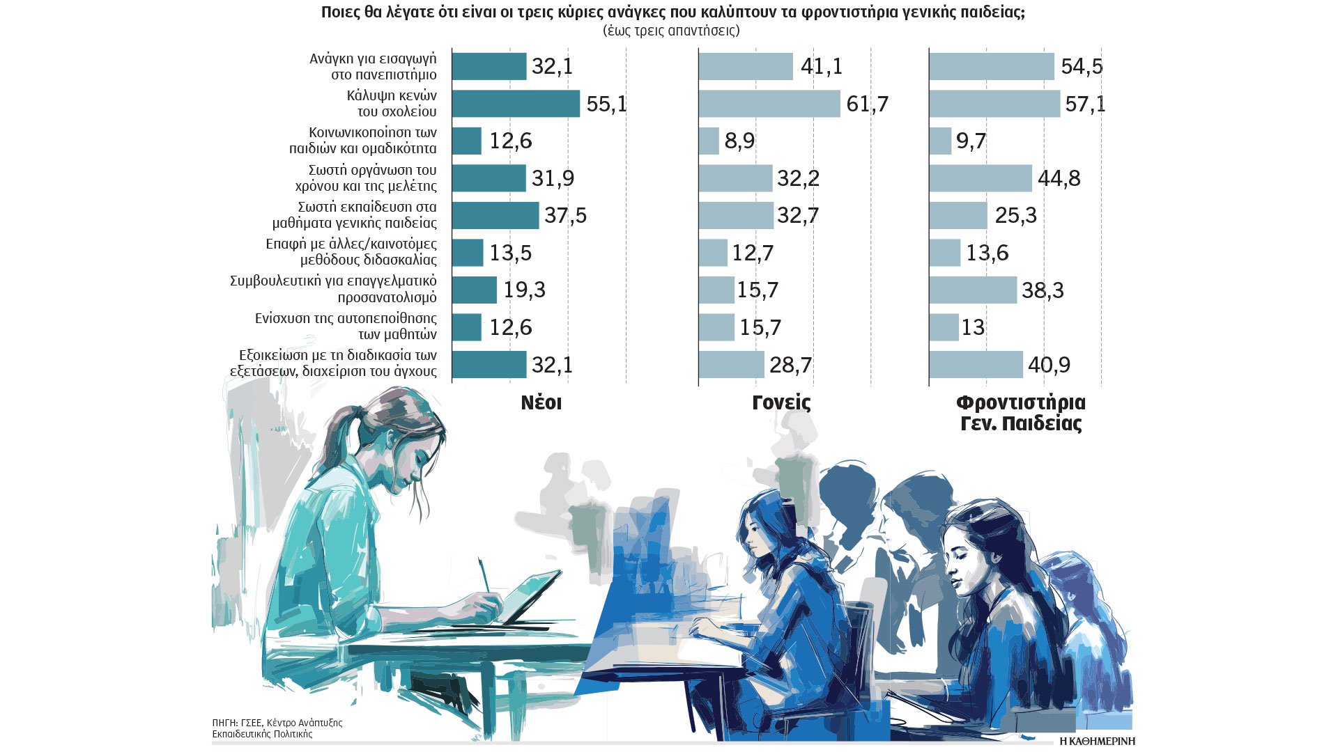 Επίσης, σχεδόν 7 στους 10 γονείς και νέους (68 και 70% αντίστοιχα) δήλωσαν αρκετά έως πολύ ικανοποιημένοι από τη φροντιστηριακή εκπαίδευση. Ωστόσο, το 50% των γονέων θεωρεί ότι τα φροντιστήρια υπερφορτώνουν τους μαθητές.