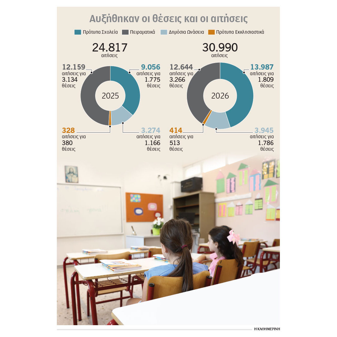 Ειδικότερα, φέτος, για τη σχολική χρονιά 2026-2027, υπεβλήθησαν συνολικά 30.990 αιτήσεις. Ο αριθμός επιμερίζεται ως εξής: