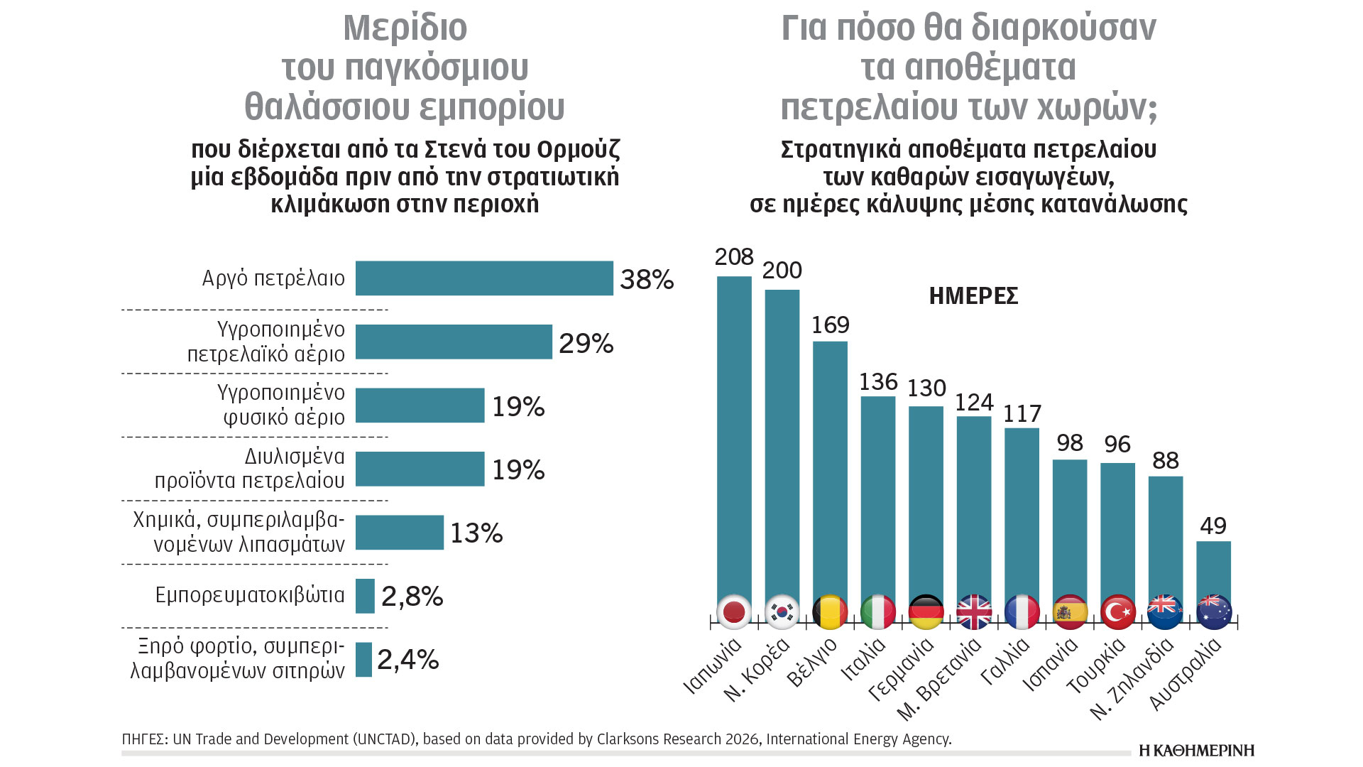 Το 38% του εμπορίου του παγκόσμιου αργού πετρελαίου διέρχεται από τα Στενά του Ορμούζ, μαζί με το 29% του υγροποιημένου πετρελαϊκού αερίου (LPG) και το 19% του υγροποιημένου φυσικού αερίου (LNG), ενώ σε μικρότερα ποσοστά διακινούνται μέσω των Στενών λιπάσματα και σιτηρά. Η ναυτιλία επηρεάζεται από αυξήσεις σε ναύλους και ασφάλιστρα κινδύνου, με οικονομικές επιπτώσεις και στον αγροτικό τομέα, καθώς σημαντικό μέρος των λιπασμάτων διακινείται μέσω της περιοχής. Σε περιόδους έντασης, τα στρατηγικά αποθέματα πετρελαίου αποκτούν κρίσιμο ρόλο. Με ελάχιστο όριο τις 90 ημέρες που θέτει ο Διεθνής Οργανισμός Ενέργειας, η Ιαπωνία και η Νότια Κορέα ξεπερνούν τις 200, οι περισσότερες ευρωπαϊκές χώρες ξεπερνούν τις 100, ενώ η Αυστραλία παραμένει χαμηλά, σε μόλις 49.