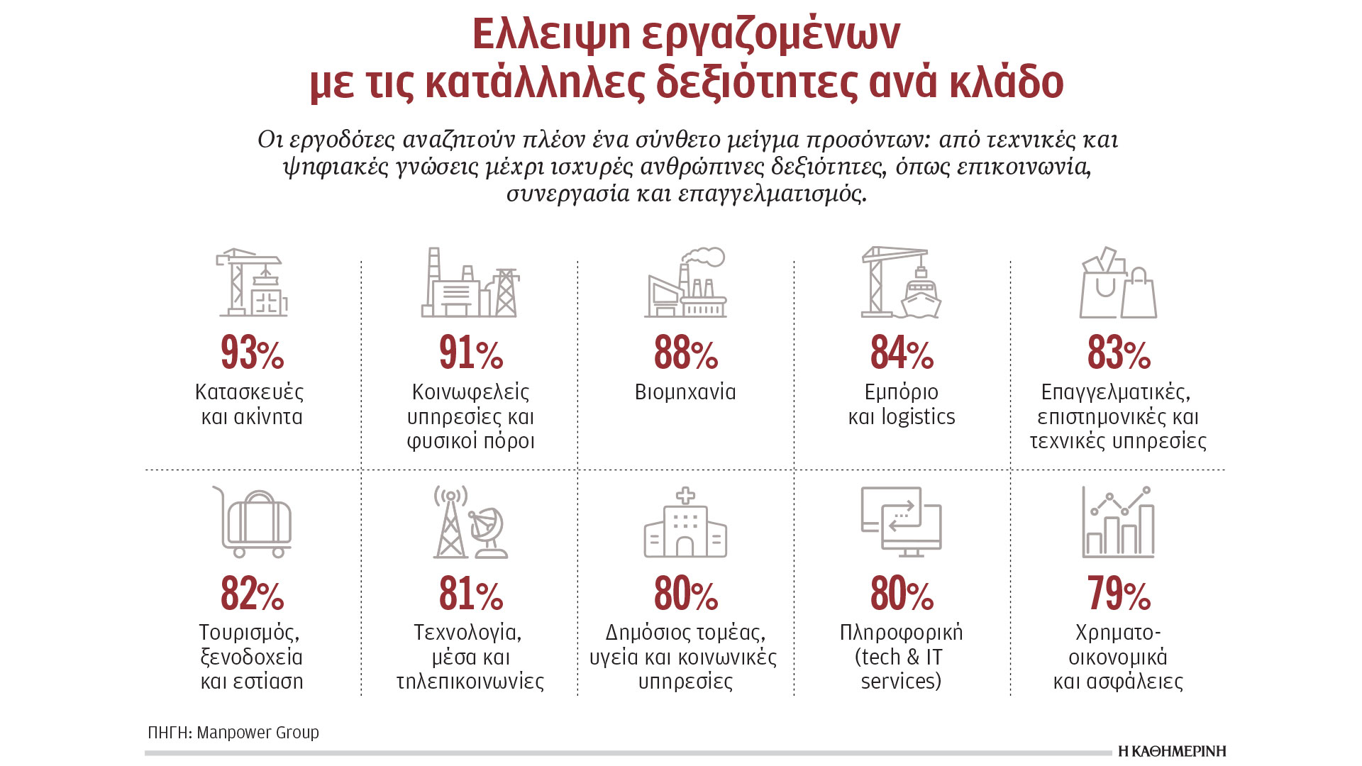 Το πρόβλημα της έλλειψης ταλέντου διαπερνά οριζόντια όλους τους κλάδους της ελληνικής οικονομίας. Οι μεγαλύτερες πιέσεις καταγράφονται στις κατασκευές και στα ακίνητα, όπου η αυξημένη δραστηριότητα δημιουργεί έντονη ζήτηση για τεχνικά επαγγέλματα. Υψηλά ποσοστά εμφανίζονται επίσης στις κοινωφελείς υπηρεσίες και στους φυσικούς πόρους, καθώς και στη βιομηχανία, ενώ σημαντικές ελλείψεις παρατηρούνται και σε τομείς όπως το εμπόριο, τα logistics, ο τουρισμός και οι υπηρεσίες τεχνολογίας.