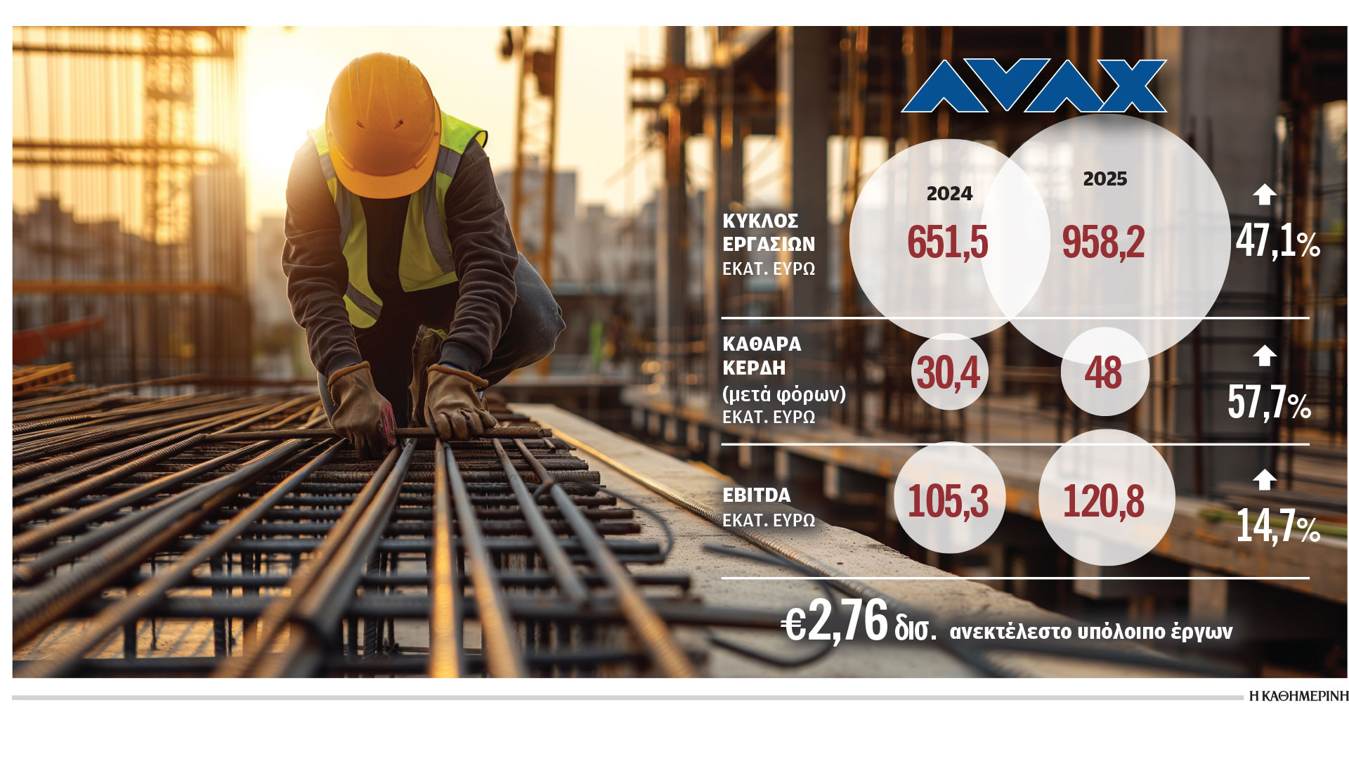 Το 2025 ο όμιλος Αβαξ κατέγραψε ιστορικά υψηλές επιδόσεις σε ό,τι αφορά τη δραστηριότητα των κατασκευών. Ο κύκλος εργασιών του ομίλου ανήλθε σε 958,2 εκατ. ευρώ, αυξημένος κατά 47,1% σε ετήσια βάση, ενώ είναι και υπερδιπλάσιος σε σχέση με τα 454 εκατ. ευρώ του 2023. Αντίστοιχα, διπλάσια έναντι του 2023 ήταν πέρυσι και τα λειτουργικά κέρδη EBITDA, τα οποία ανήλθαν σε 120,8 εκατ. ευρώ, από 61 εκατ. ευρώ το 2023 και 105,3 εκατ. ευρώ το 2024. Σημαντικό είναι επίσης το ότι έχει αυξηθεί σε μεγάλο βαθμό και το περιθώριο EBITDA, από 6,2% το 2023 σε 10,8% το 2025. Τα καθαρά κέρδη μετά από φόρους αυξήθηκαν επίσης κατά 57,7% σε 48 εκατ. ευρώ, έναντι 30,4 εκατ. ευρώ το 2024, λόγω των μειωμένων χρηματοοικονομικών εξόδων από τη βελτίωση του περιθωρίου επιτοκίου που επιτεύχθηκε, εξαιτίας της βελτίωσης της πιστοληπτικής ικανότητας της εταιρείας. Επίσης, για ακόμη ένα έτος μειώθηκε ο δανεισμός, καθώς υποχώρησε σε 200,9 εκατ. ευρώ, από 237,5 εκατ. ευρώ το 2024.