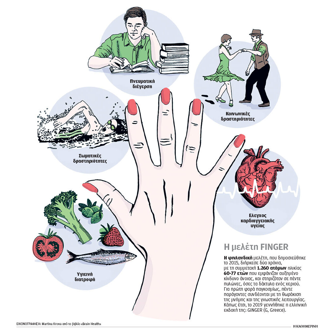 Ηταν 2019 όταν διακεκριμένοι Ελληνες ερευνητές από το Πανεπιστήμιο Johns Hopkins των ΗΠΑ ένωσαν την επιστημονική τους γνώση και την εργαστηριακή τους εμπειρία με συναδέλφους τους από το Ιόνιο Πανεπιστήμιο και άλλους διαπρεπείς επιστήμονες που ασχολούνται με την άνοια στην Ελλάδα, για να αντιμετωπίσουν από κοινού την ασθένεια και τις σχετικές διαταραχές της στη χώρα μας. Ιδρυσαν την Ελληνική Πρωτοβουλία ενάντια στην Αλτσχάιμερ. Πυξίδα τους έγινε η φινλανδική μελέτη FINGER. Διήρκεσε δύο χρόνια, με τη συμμετοχή 1.260 ατόμων ηλικίας 60-77 ετών που εμφάνιζαν αυξημένο κίνδυνο άνοιας, και στηριζόταν σε πέντε πυλώνες, όσες τα δάχτυλα ενός χεριού: την υιοθέτηση υγιεινής διατροφής, την τακτική σωματική δραστηριότητα, τη γνωστική εκπαίδευση με ασκήσεις μνήμης και νοητικές δραστηριότητες, την κοινωνική δραστηριότητα και τη διαχείριση των καρδιαγγειακών παραγόντων, όπως η αρτηριακή πίεση, η χοληστερίνη και το σάκχαρο.