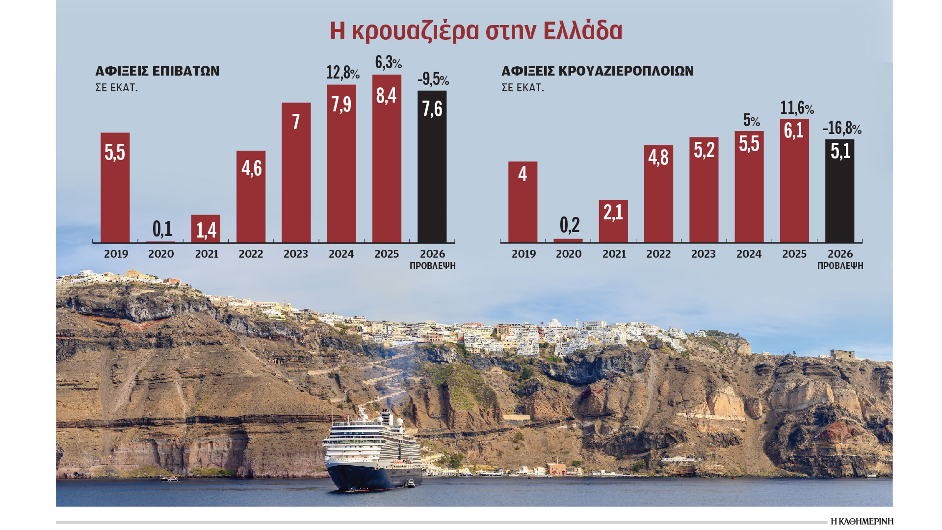 Υστερα από μια παρατεταμένη περίοδο ανόδου, που κορυφώθηκε με τις ιστορικές επιδόσεις του προηγούμενου έτους, η βιομηχανία της κρουαζιέρας στην Ελλάδα εμφανίζεται να εισέρχεται σε φάση αναδίπλωσης, καθώς οι γεωπολιτικές αναταράξεις στην ευρύτερη περιοχή του Περσικού Κόλπου και της Μέσης Ανατολής ανατρέπουν τους σχεδιασμούς των μεγάλων ομίλων, όπως βέβαια και τη ζήτηση από δυνητικούς επιβάτες.