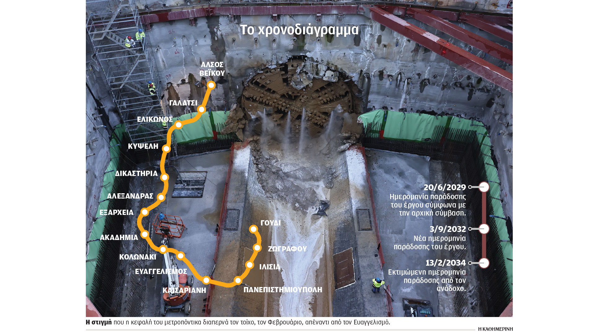 • Στις 9 Φεβρουαρίου 2026, η εταιρεία «Ελληνικό Μετρό» ενέκρινε το νέο χρονοδιάγραμμα του έργου. Με αυτό, η ημερομηνία παράδοσης του έργου μετατίθεται πλέον από τις 20.6.2029 στις 3.9.2032. Με την απόφαση αυτή η εταιρεία ζήτησε από την κοινοπραξία να επιστρέψει στο Δημόσιο το «πριμ έγκαιρης παράδοσης του έργου» ύψους 57,7 εκατ. ευρώ (5% του έργου, που έχει προϋπολογισμό 1,15 δισ. ευρώ χωρίς ΦΠΑ) που έλαβε στα τέλη του 2022 (η σύμβαση υπογράφηκε στις 22.6.2021). Αξίζει να σημειωθεί ότι στις 12 Φεβρουαρίου η ηγεσία του υπουργείου Υποδομών, παρουσία εκπροσώπων της κοινοπραξίας, διοργάνωσε εκδήλωση για την ολοκλήρωση της διάνοιξης του πρώτου σκέλους της σήραγγας, κάνοντας δηλώσεις, αλλά αποσιωπώντας την ήδη αποφασισμένη τριετή παράταση στο έργο.