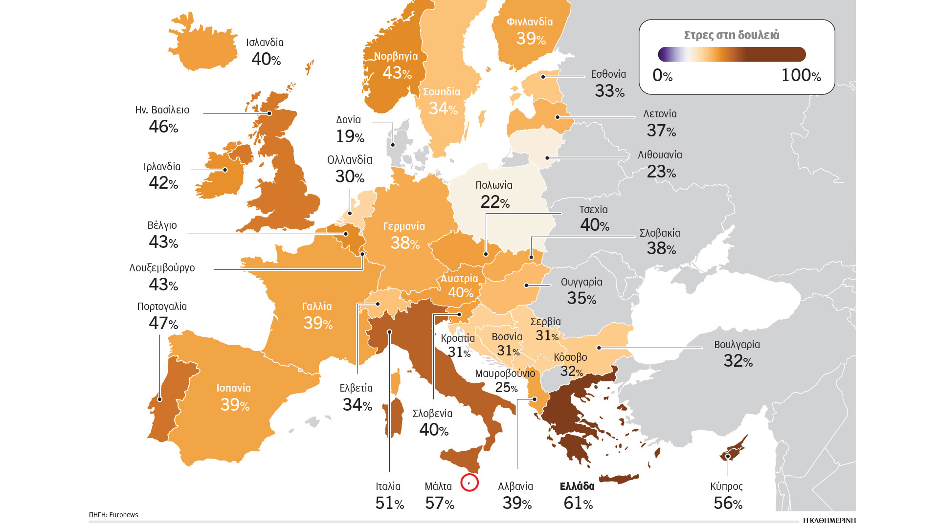 Την ίδια στιγμή, Δανοί (19%), Πολωνοί (22%) και Λιθουανοί (23%) μοιάζουν να νιώθουν τη λιγότερη πίεση στους χώρους εργασίας τους.