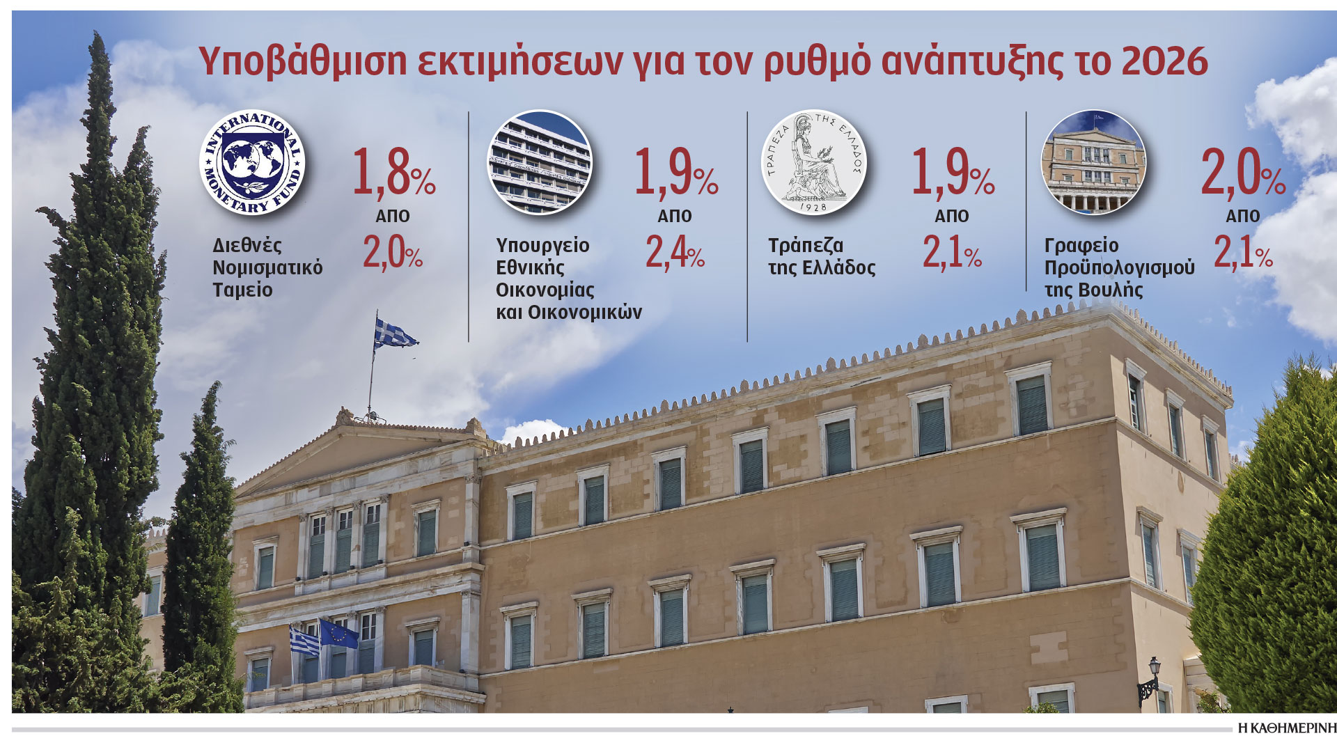 Το ΔΝΤ τοποθετεί πλέον στο 1,8% την ανάπτυξη της Ελλάδας (από 2% τον Οκτώβριο 2025), ενώ η Τράπεζα της Ελλάδος έχει αναθεωρήσει ήδη από τον Μάρτιο πτωτικά την ανάπτυξη φέτος, στο 1,9% από 2,1% πριν (χωρίς ωστόσο να λαμβάνει υπόψη πρόσθετα μέτρα δημοσιονομικής και νομισματικής πολιτικής λόγω του πολέμου) και τον πληθωρισμό στο 3,1% από 2,1% που ήταν η προηγούμενη πρόβλεψη. Το Γραφείο Προϋπολογισμού της Βουλής προβλέπει ανάπτυξη 2% φέτος από 2,1% πριν, ενώ εκπόνησε δυσμενές σενάριο με άνοδο του πληθωρισμού στο 4% φέτος και πτώση της ανάπτυξης στο 1,7% εξαιτίας του πολέμου στη Μέση Ανατολή.