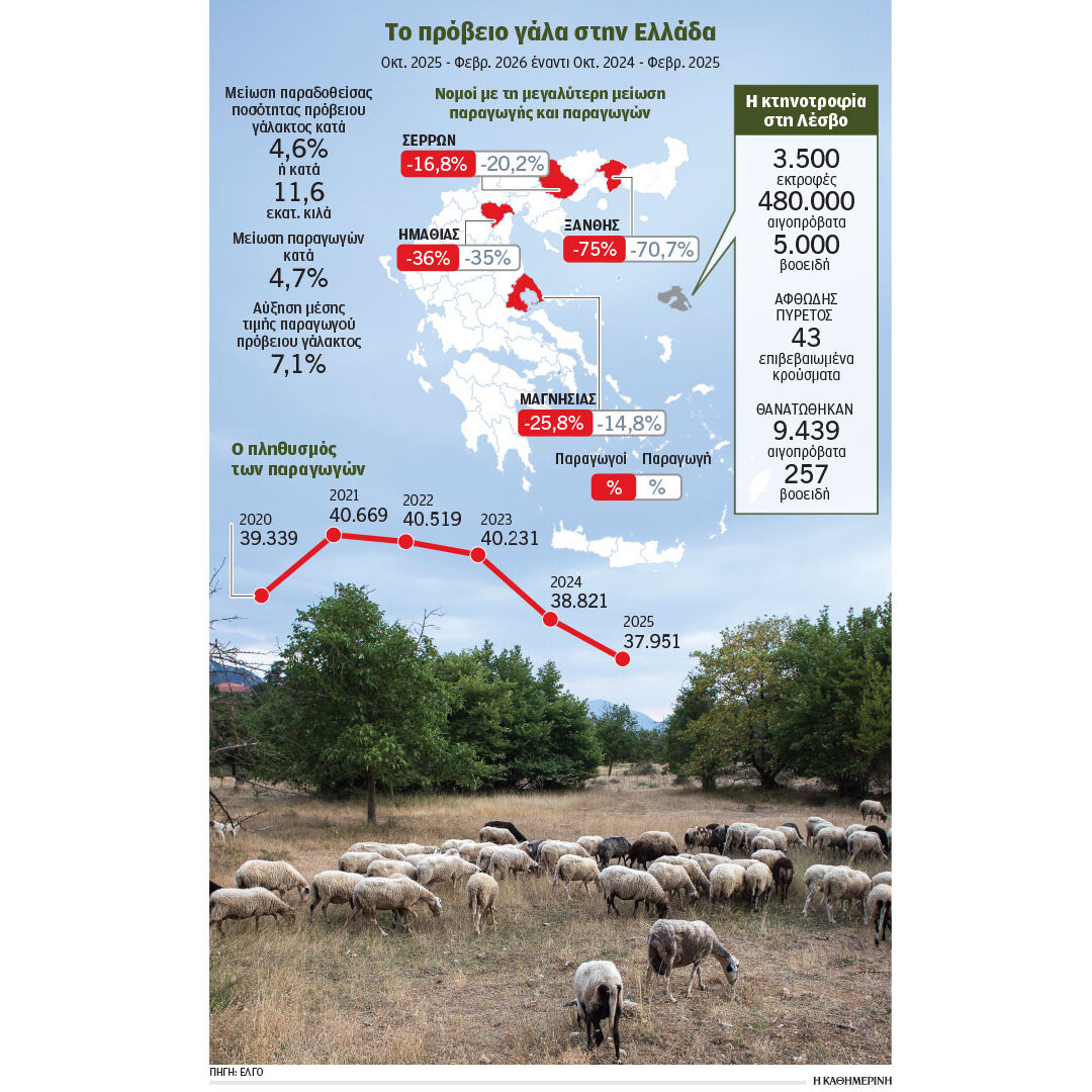 Μόνο μέσα στο πεντάμηνο Οκτωβρίου 2025 – Φεβρουαρίου 2026, περίοδο κατά την οποία παρατηρήθηκε έξαρση των κρουσμάτων της ευλογιάς, η συνολική παραδοθείσα ποσότητα πρόβειου γάλακτος ήταν λιγότερη κατά 11.500 τόνους ή κατά 4,6% σε σύγκριση με το πεντάμηνο Οκτωβρίου 2024 – Φεβρουαρίου 2025, περίοδο που η ευλογιά ήταν στους πρώτους μήνες εμφάνισής της στην ελληνική προβατοτροφία. Και μπορεί αυτή η μείωση κατά 4,6% να φαίνεται μικρή, όμως το πρόβλημα είναι πολλαπλάσιο σε συγκεκριμένες περιοχές. Αξίζει, δε, να σημειωθεί ότι στα στοιχεία δεν αποτυπώνεται ακόμη ο αντίκτυπος από τον αφθώδη πυρετό που πλήττει την κτηνοτροφία στη Λέσβο.
