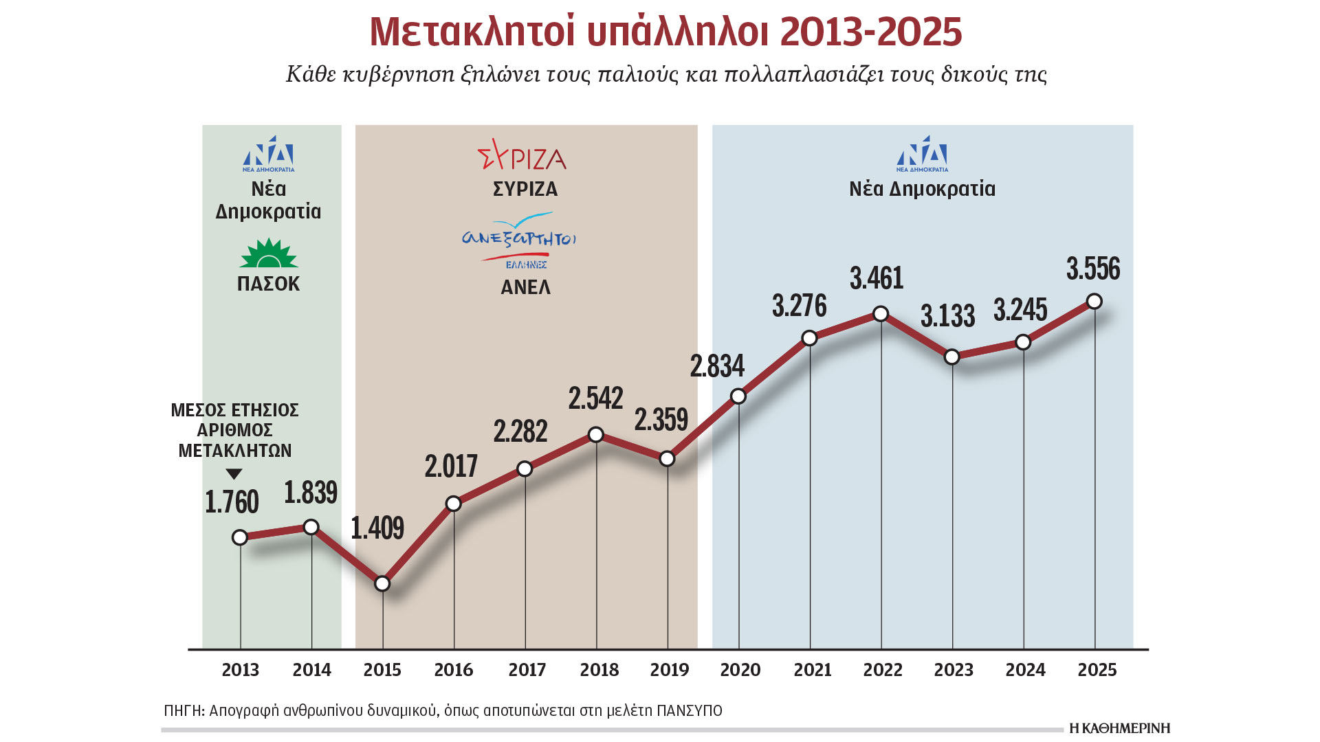 Μελέτη του Πανελλήνιου Συλλόγου Υπαλλήλων ΟΑΕΔ – τ. ΟΕΕ – τ. ΟΕΚ (ΠΑΝΣΥΠΟ), που βασίζεται σε αναλυτικά στατιστικά στοιχεία για την Ελλάδα, αντλημένα από επίσημες πηγές, καταγράφει την πραγματική εικόνα των μετακλητών υπαλλήλων στη χώρα. Και παρουσιάζει μια εικόνα που δεν αφήνει πλέον περιθώρια ωραιοποίησης. Τα επίσημα στοιχεία αποκαλύπτουν μια εκρηκτική και διαχρονικά επιταχυνόμενη αύξηση των μετακλητών, που μεταβάλλει ουσιωδώς τη φυσιογνωμία της δημόσιας διοίκησης. Το 2013, οι μετακλητοί ανέρχονταν σε 1.760 άτομα. Τον Οκτώβριο του 2025 φθάνουν τους 3.556. Πρόκειται για αύξηση άνω του 100%. Ακόμη πιο αποκαλυπτικός είναι ο τρόπος που αλλάζουν αυτοί οι αριθμοί μέσα στον χρόνο. Κάθε φορά που αλλάζει η κυβέρνηση, ο αριθμός των μετακλητών πέφτει απότομα και στη συνέχεια αρχίζει πάλι να ανεβαίνει. Το 2015, για παράδειγμα, υπήρξε περίοδος που μειώθηκαν στους 845 –ενώ ο μέσος ετήσιος αριθμός τους ήταν 1.409– και μετά αυξήθηκαν ξανά. Το ίδιο συνέβη το 2019 και το 2024. Αυτό δείχνει ότι δεν μιλάμε για έναν σταθερό διοικητικό μηχανισμό, αλλά για ένα σύστημα που «γκρεμίζεται» και «ξαναχτίζεται» κάθε φορά από την αρχή, ακόμη κι αν παρέμεινε στην εξουσία το ίδιο κόμμα.