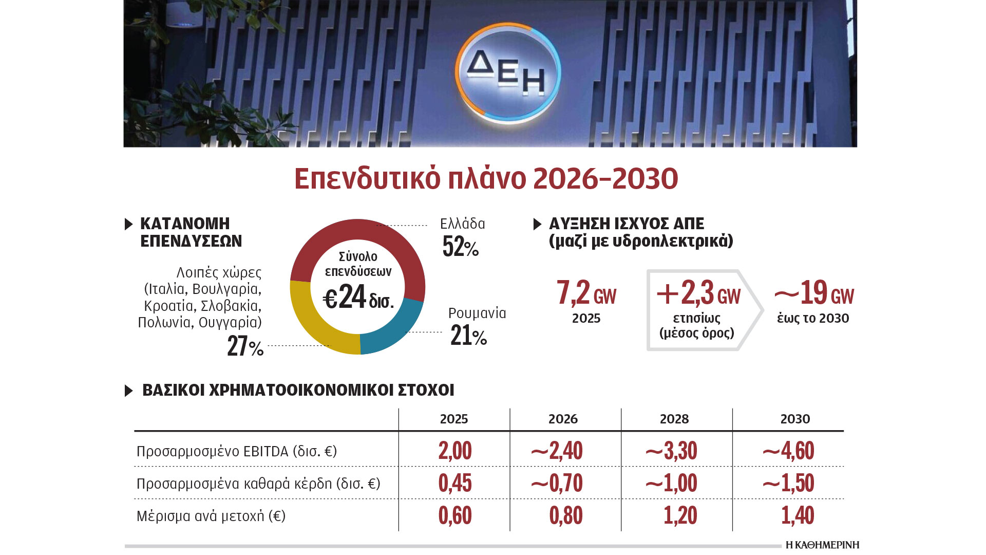 Σε μία από τις πιο φιλόδοξες στρατηγικές κινήσεις των τελευταίων ετών για ελληνική επιχείρηση προχωράει η ΔΕΗ, ανακοινώνοντας ένα επενδυτικό σχέδιο ύψους 24 δισ. ευρώ έως το 2030, που φιλοδοξεί να καλύψει το αυξανόμενο ενεργειακό κενό στην ευρύτερη περιοχή της Κεντρικής και Νοτιοανατολικής Ευρώπης, με βασικό εργαλείο χρηματοδότησης την αύξηση μετοχικού κεφαλαίου – μαμούθ, ύψους 4 δισ. ευρώ.