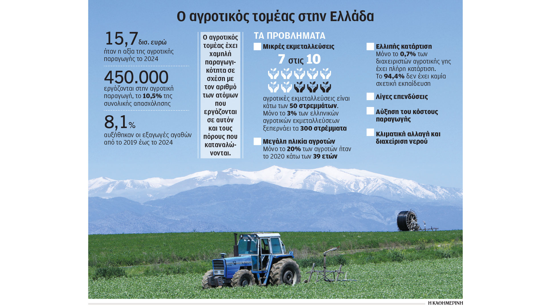 Το σύνολο της ελληνικής αγροτικής παραγωγής το 2024 ήταν 15,7 δισ. ευρώ και στον τομέα εργάζονται 450.000 άτομα. Παράγουμε κυρίως φρούτα, που κατέχουν την πρώτη θέση με μερίδιο 32% το 2024. Στη δεύτερη θέση βρίσκονται τα ζωικά προϊόντα με 15% και ακολουθούν το ελαιόλαδο (13%), τα λαχανικά και οπωροκηπευτικά (13%). Το 85% των παραγόμενων προϊόντων αφορά την εγχώρια χρήση είτε από τα νοικοκυριά είτε από τη βιομηχανία, τον τουρισμό και την εστίαση.