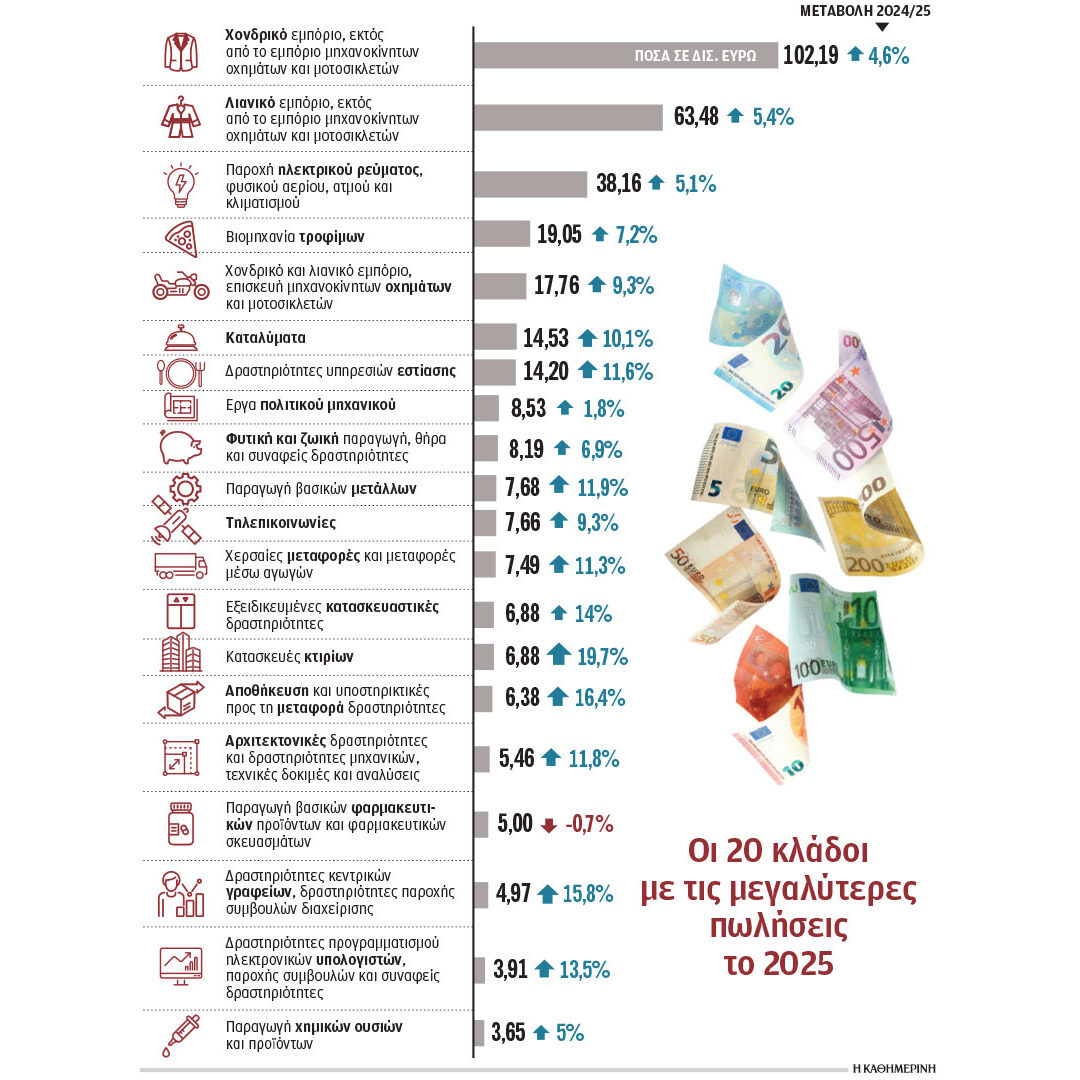 Σύμφωνα με τα στοιχεία της ΑΑΔΕ, η πλειονότητα των επιχειρηματικών δραστηριοτήτων κινήθηκε ανοδικά, καθώς 79 από τους 87 κλάδους κατέγραψαν αύξηση πωλήσεων, ενώ μόλις οκτώ παρουσίασαν πτώση. Μεταξύ των λίγων εξαιρέσεων συγκαταλέγεται η παραγωγή βασικών φαρμακευτικών προϊόντων και σκευασμάτων, που κινήθηκε οριακά πτωτικά.