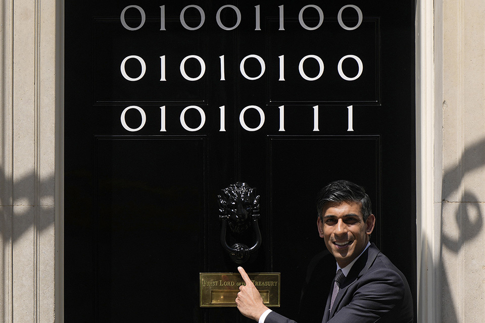 Αλλαξε αριθμό η κατοικία του πρωθυπουργού στην Ντάουνινγκ Στρίτ και δεν είναι πια στο 10 του δρόμου. Με αφορμή την Τεχνολογική Εβδομάδα του Λονδίνου ο αριθμός της πρωθυπουργικής κατοικίας έγινε δυαδικός, 010101.. σε μια πρώτης τάξης διαφήμιση για την εκδήλωση. Στην φωτογραφία ο πρωθυπουργός Ρίσι Σούνακ.