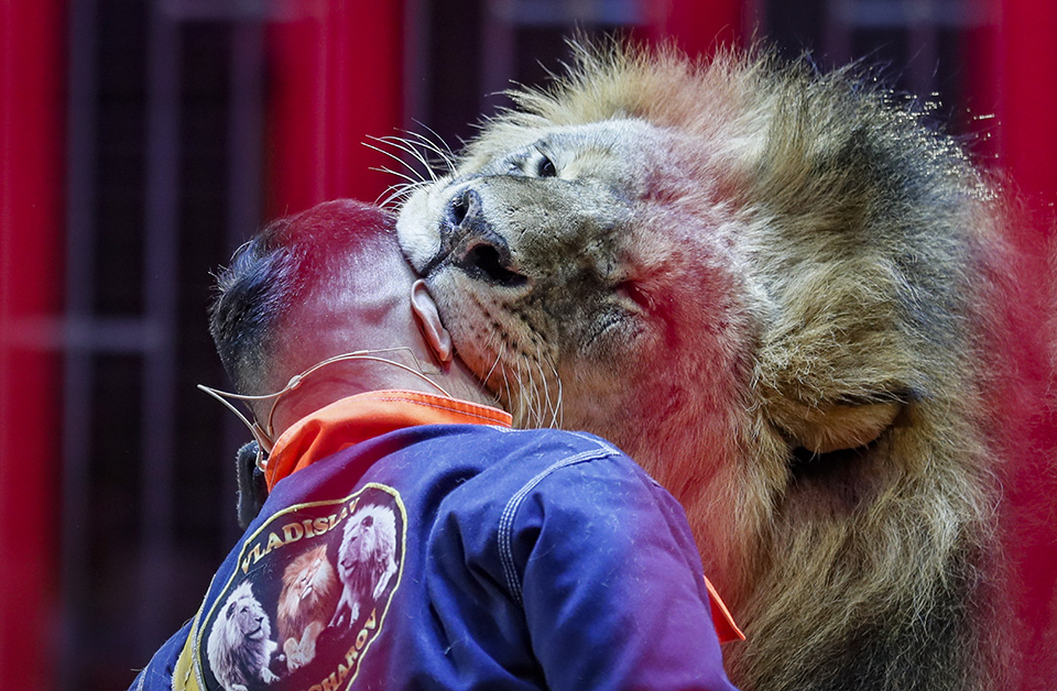 Το αμφιθέατρο φτιαγμένο αποκλειστικά για το Μεγάλο Τσίρκο της Μόσχας, μπορεί να φιλοξενήσει 3.400 θεατές. Το Τσίρκο ιδρύθηκε το 1971 και έχει τουλάχιστον 300 άτομα καλλιτεχνικό προσωπικό με σκοπό να παρουσιάσει μια άρτια παράσταση στο κοινό που περιλαμβάνει κλόουν, μάγους, ακροβάτες και δυστυχώς ζώα. Στην φωτογραφία ο θηριοδαμαστής Vladislav Goncharov επιδεικνύει την υπομονή του λιονταριού να κρατάει το κεφάλι του κυρίου με το μαστίγιο, μέσα στο στόμα του.