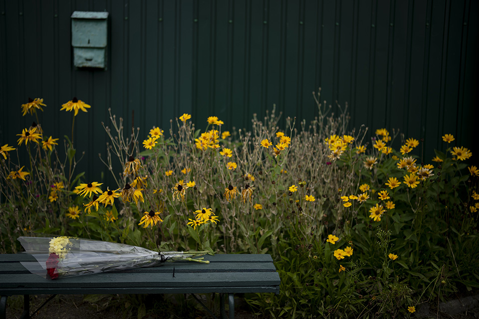 Μια λιτή ανθοδέσμη είναι αφημένη σε πάγκο έξω από το σπίτι του Oleksander Mykhailensko στο ανθισμένο με κίτρινες μαργαρίτες Zhukin στην Ουκρανία. O Oleksander έχασε την ζωή του στο πεδίο της μάχης στην Ουκρανία φέτος τον Μάρτιο αλλά μόλις τώρα αναγνωρίστηκε από τους οικίους του και έγινε πικρή πραγματικότητα ο θάνατός του.