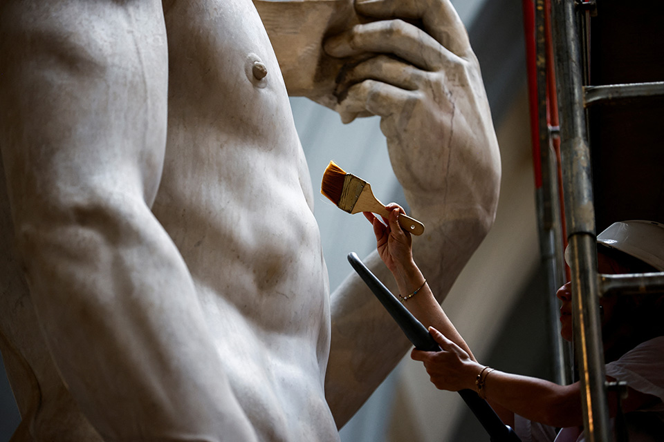 Φυσικά με ένα παχύ πινέλο, με την βοήθεια μιας ηλεκτρικής σκούπας αλλά και ενός τεράστιου γερανού, γίνεται το ετήσιο καθάρισμα του Δαβίδ. Η μόνιμη συντηρήτρια Eleonora Pucci της Galleria dell’Accademia, δεν καθαρίζει μόνο το άγαλμα του Μιχαήλ Αγγελου αλλά ελέγχει σπιθαμή προς σπιθαμή την καλή του κατάσταση.
