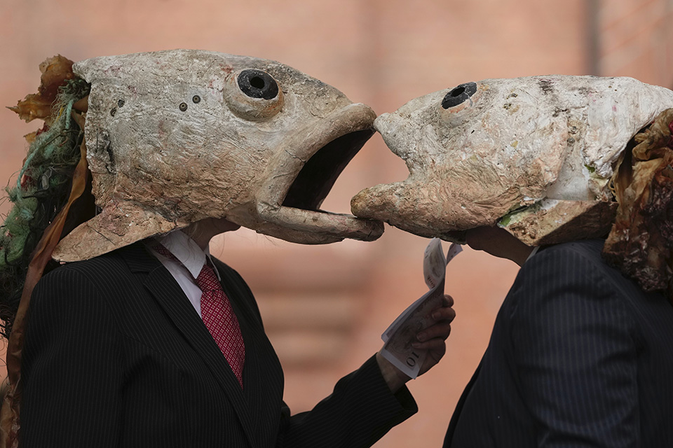 Εχει περάσει καιρός από τότε που οι ομάδες ακτιβιστών κατάλαβαν ότι εισακούονται καλύτερα όσο η εικόνα που παράγουν στις διαμαρτυρίες τους έχει σαφές και εικονογραφικό μήνυμα. Στο πλαίσιο αυτό η περιβαλλοντική ομάδα ακτιβιστών Ocean Rebellion ντύθηκε με κοστούμια και κεφάλια ψαριών για να διαμαρτυρηθεί έξω από το τμήμα περιβάλλοντος (DEFRA) στο Λονδίνο για την υπεραλίευση των θαλασσών.