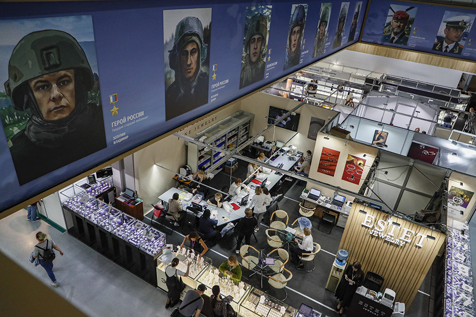 Με τις εικόνες των Ρώσων στρατιωτών που υπηρετούν είναι στολισμένη ψηλά η έκθεση Junwex Moscow 2023, καθώς οι κυρίες αγοράζουν διαμάντια. Η Ευρωπαική Ενωση σκοπεύει να σταματήσει το εμπόριο διαμαντιών από την Ρωσία (το ένα τρίτο του παγκόσμιου εμπορίου διαμαντιών προέρχονται από την κρατική εταιρία Alrosa που αποφέρει στην χώρα 4.5 δισ. δολάρια κάθε χρόνο) ως αποτέλεσμα του πολέμου στην Ουκρανία.