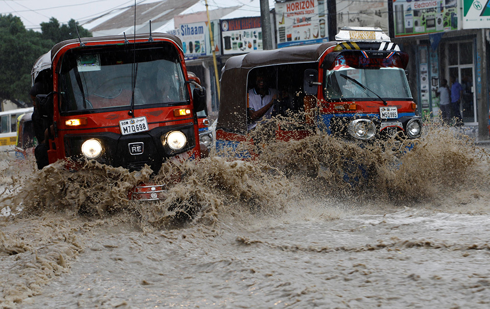 Τα μικρά ταξί μόλις που καταφέρνουν να διασχίσουν τον κεντρικό δρόμο KM5 στο Μογκαντίσου, καθώς οι έντονες βροχοπτώσεις έχουν οδηγήσει σε έντονα πλημμυρικά φαινόμενα σε περιοχές της Σομαλίας.