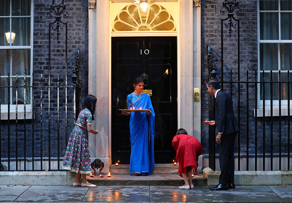 Με μικρά πήλινα λυχναράκια στόλισαν την εξώπορτα της πρωθυπουργικής κατοικίας στην Ντάουνινγκ στριτ. Η σύζυγος του Βρετανού πρωθυπουργού ντυμένη με σάρι κουβαλούσε σε δίσκο και άλλα πέρα από αυτά που κρατούσε ο Σούνακ και τα παιδιά τους, με αφορμή την ινδουιστική γιορτή Diwali.